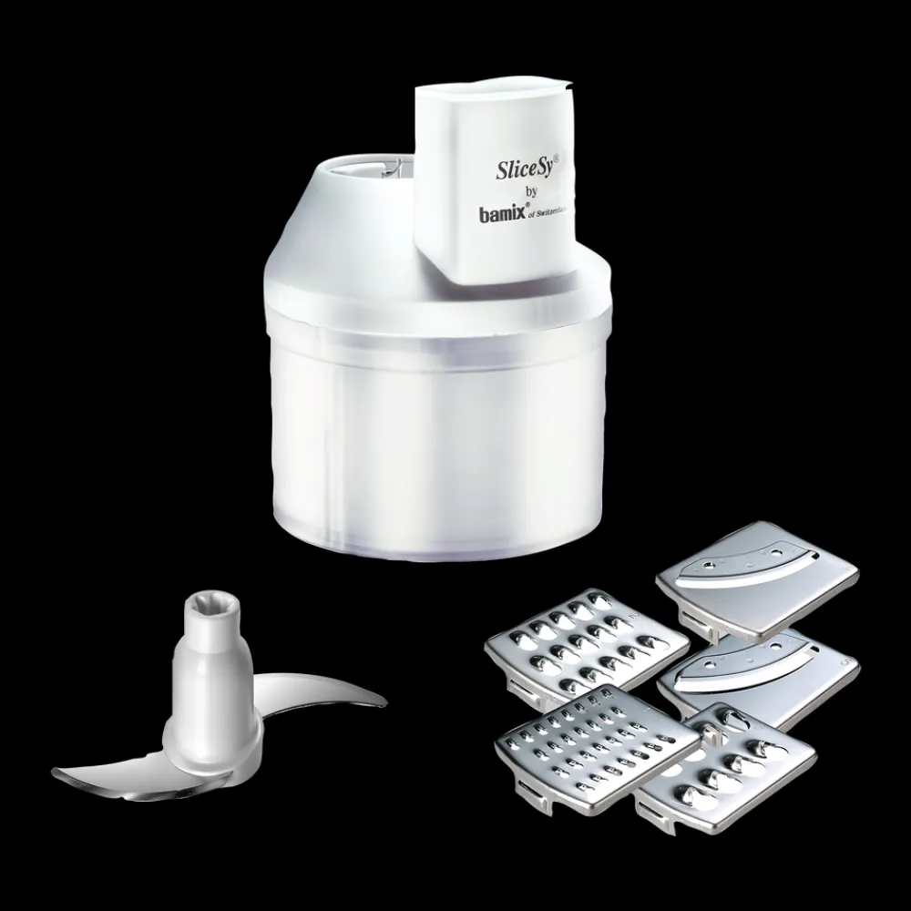 bamix®-tilbehør. SliceSy® til at hakke, rive, snitte og kværne – det hele klaret på den halve tid. Kan også bruges til at røre og blande dej. Produktet har en kapacitet på ca. 6 dl og leveres med 5 knivblade.