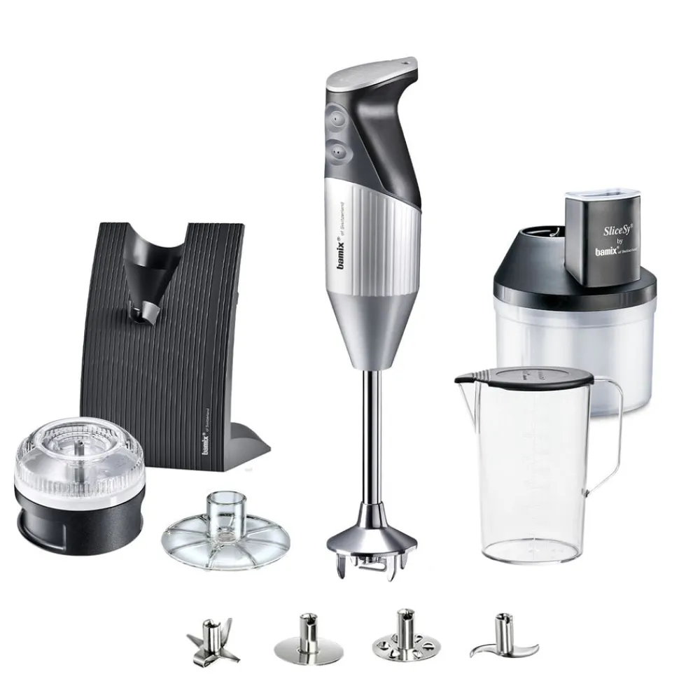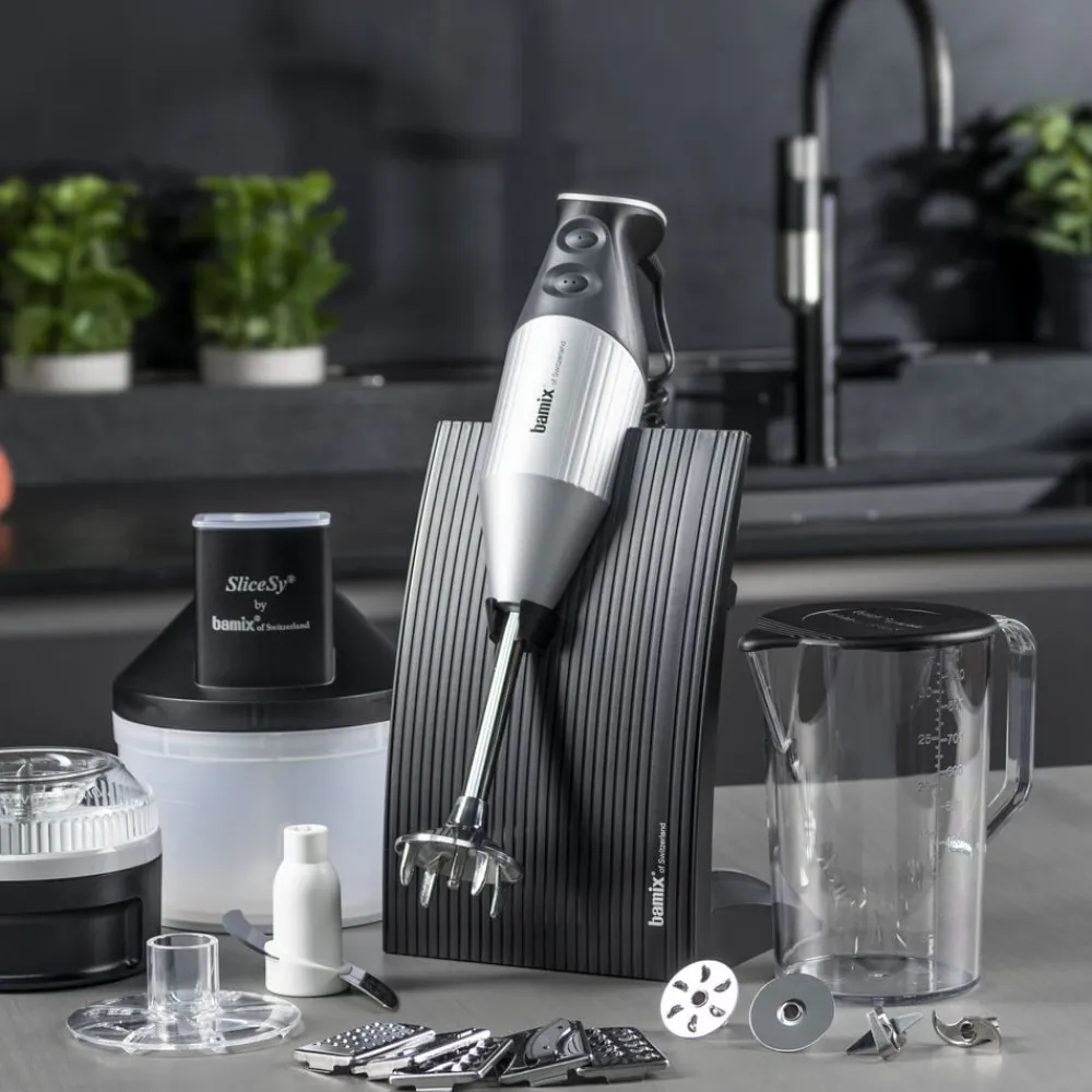 Med din bamix® Swissline Superbox og dens tilbehør kan du piske, purere, løsne, røre, blende, snitte, mikse, male, rive, skære og hakke.