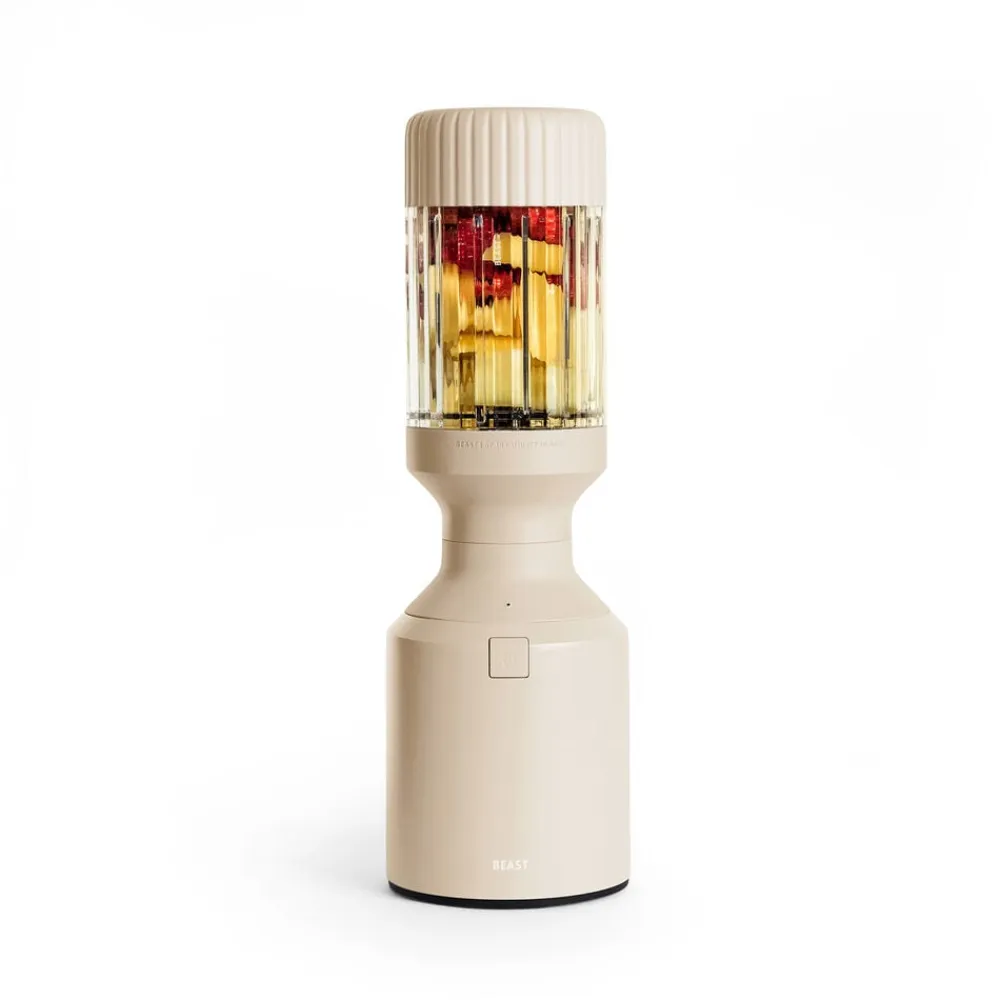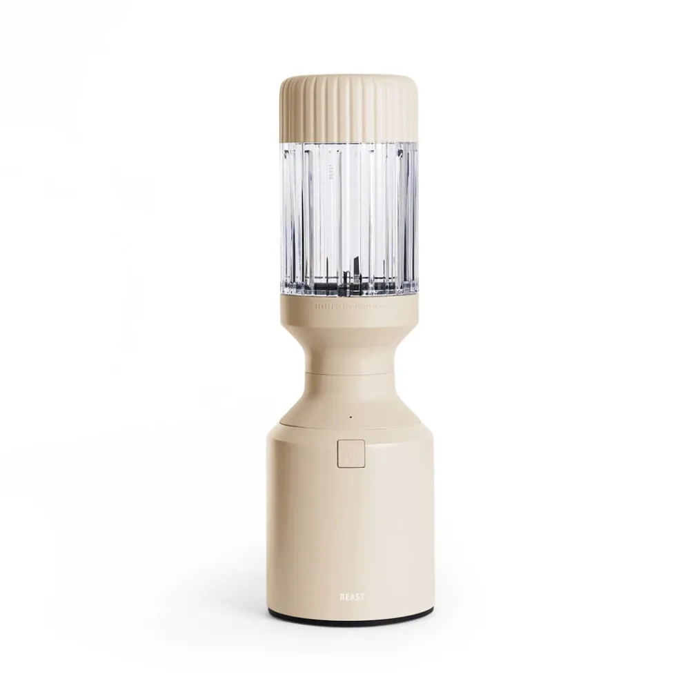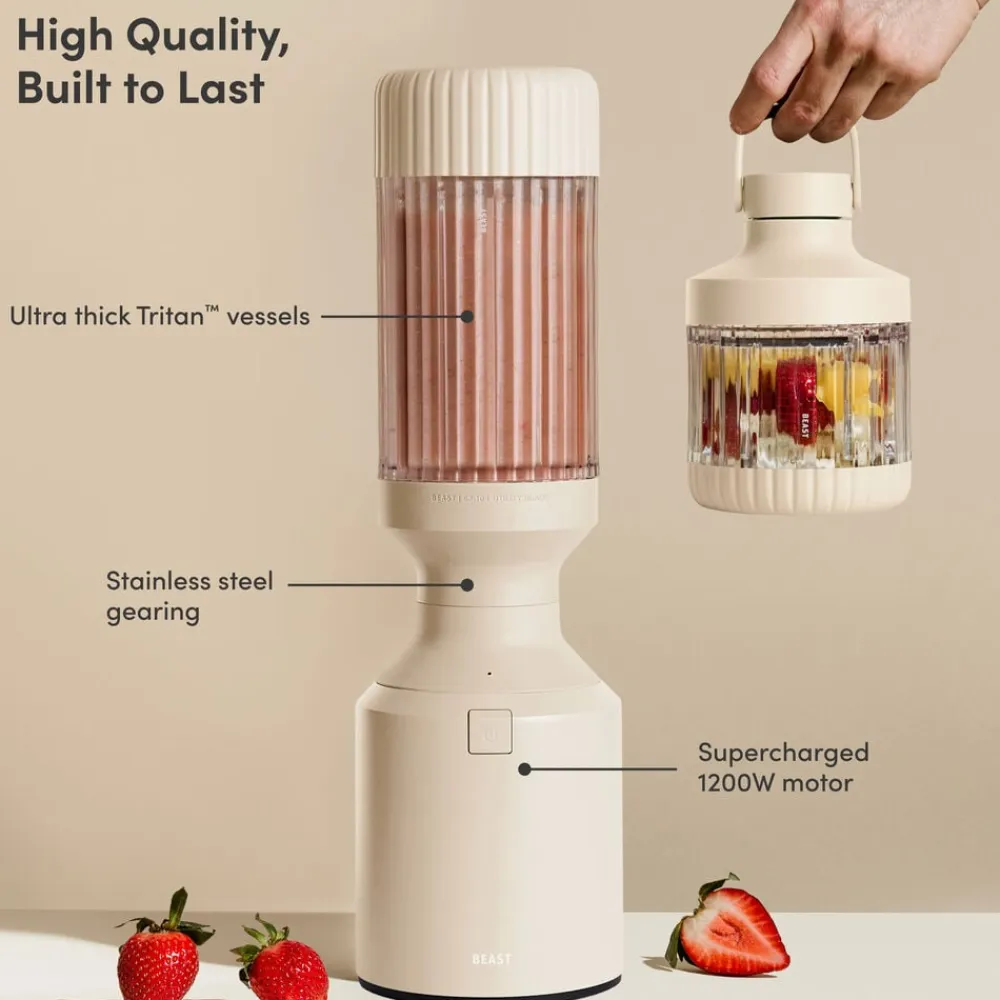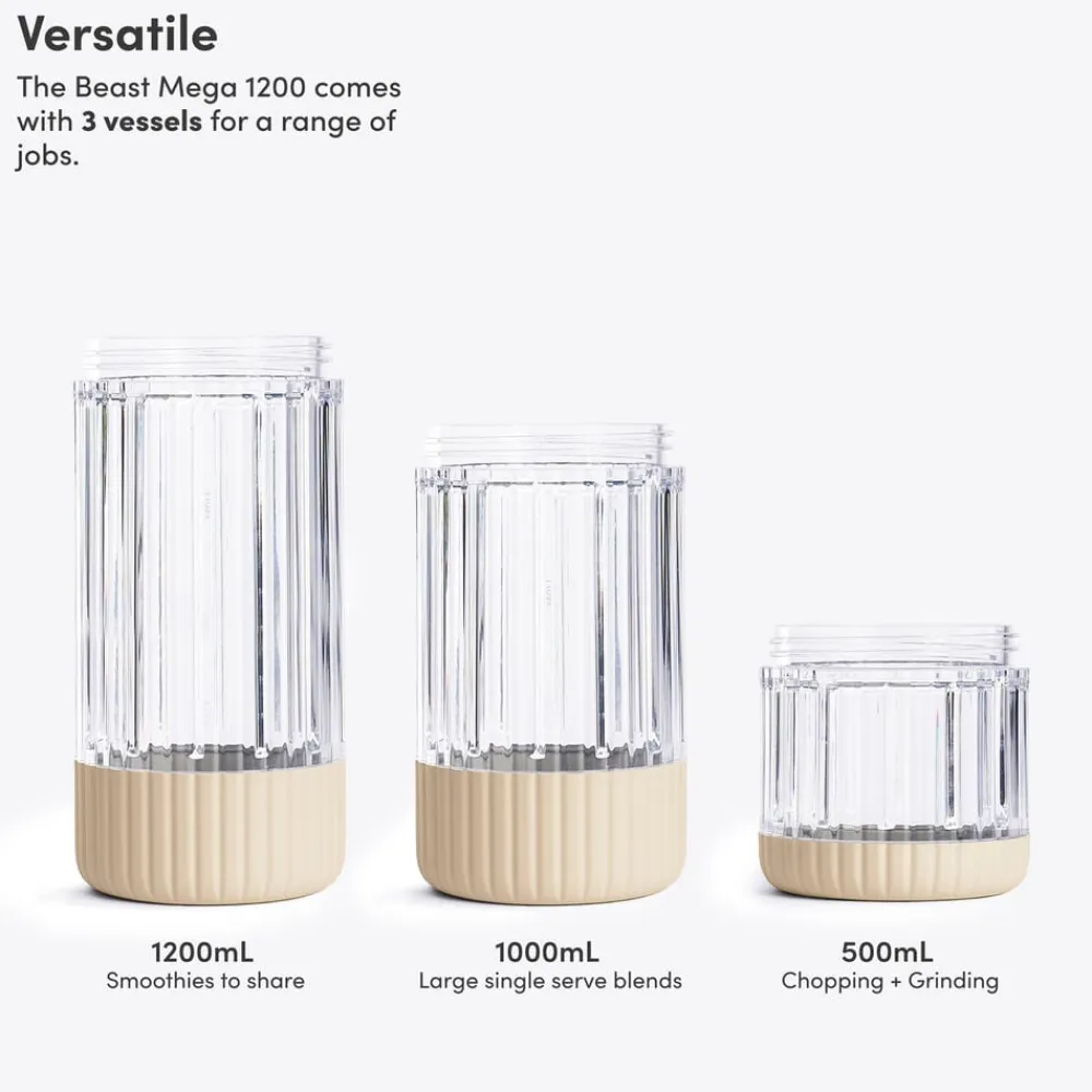 Beast Mega Plus 1200 leveres med tre blenderbeholdere (500, 1000 og 1200 ml), der fungerer som drikkebeholdere, når du sætter drikkelåg og sugerørshætte på og tager dem med dig på farten. Den rillede beholder giver dig et godt greb.