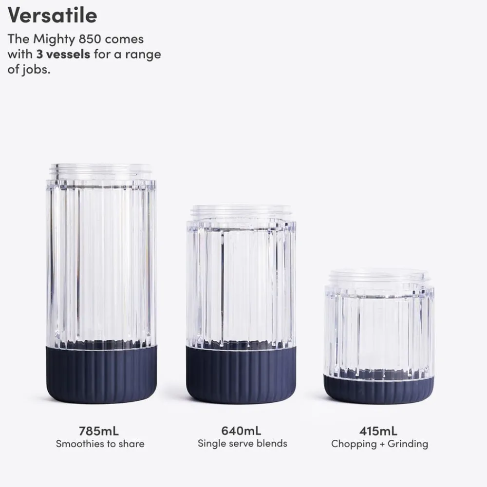Beast Mighty Plus 850 leveres med tre blenderbeholdere (415, 638 og 786 ml), der fungerer som drikkebeholdere, når du sætter drikkelåg og sugerørshætte på og tager dem med dig på farten. Den rillede beholder giver dig et godt greb.