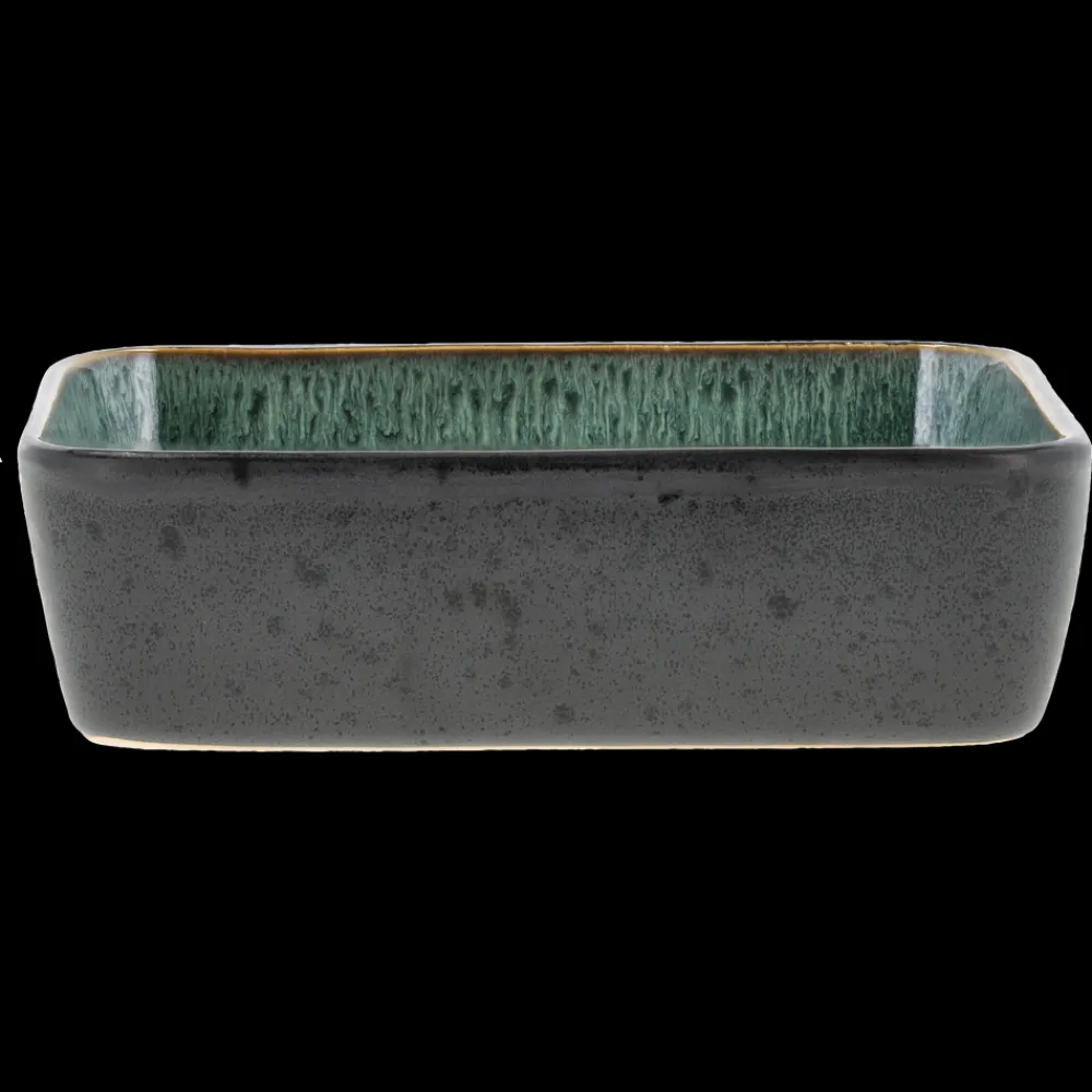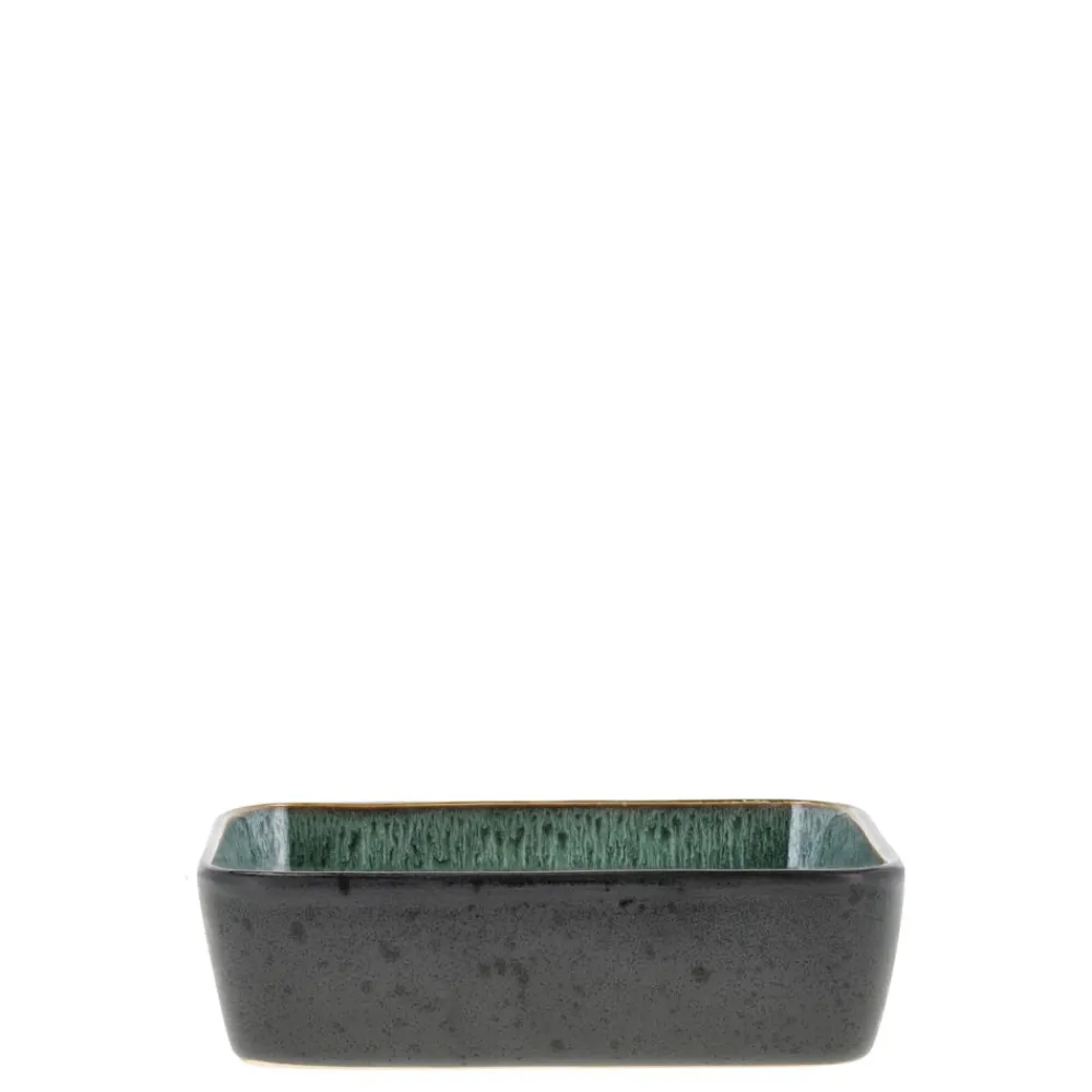 BITZ’ rektangulære fad i mat, sort stentøj med blank grøn glasur på indersiden måler 14 x 19 cm og er 5,3 cm højt. Det flotte fad fås i to størrelser og i flere fantastiske farvestillinger med en unik, reaktiv glasur, der fremhæver stentøjets glød.