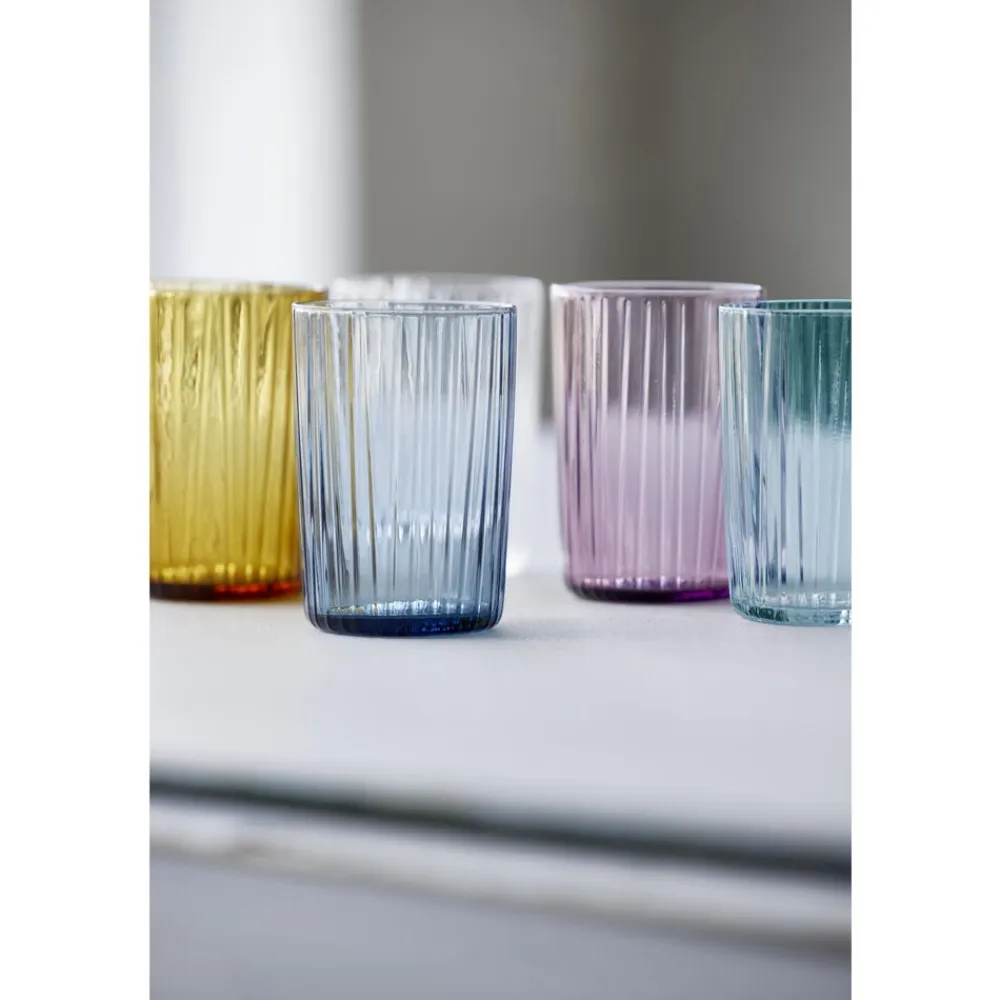 De flotte vandglas i gennemfarvet glas har det samme fine, riflede look som Kusintha-seriens vandflasker. Glassene fås i grøn, amber, pink, blå og en helt klar udgave. Når du køber fra Kusintha-kollektionen, støtter du samtidig udsatte børn i verdens fattigste områder.