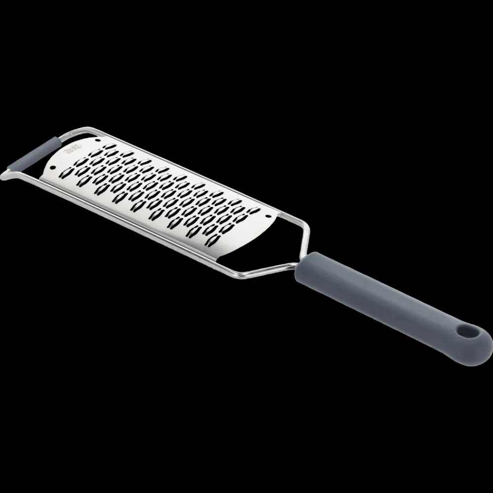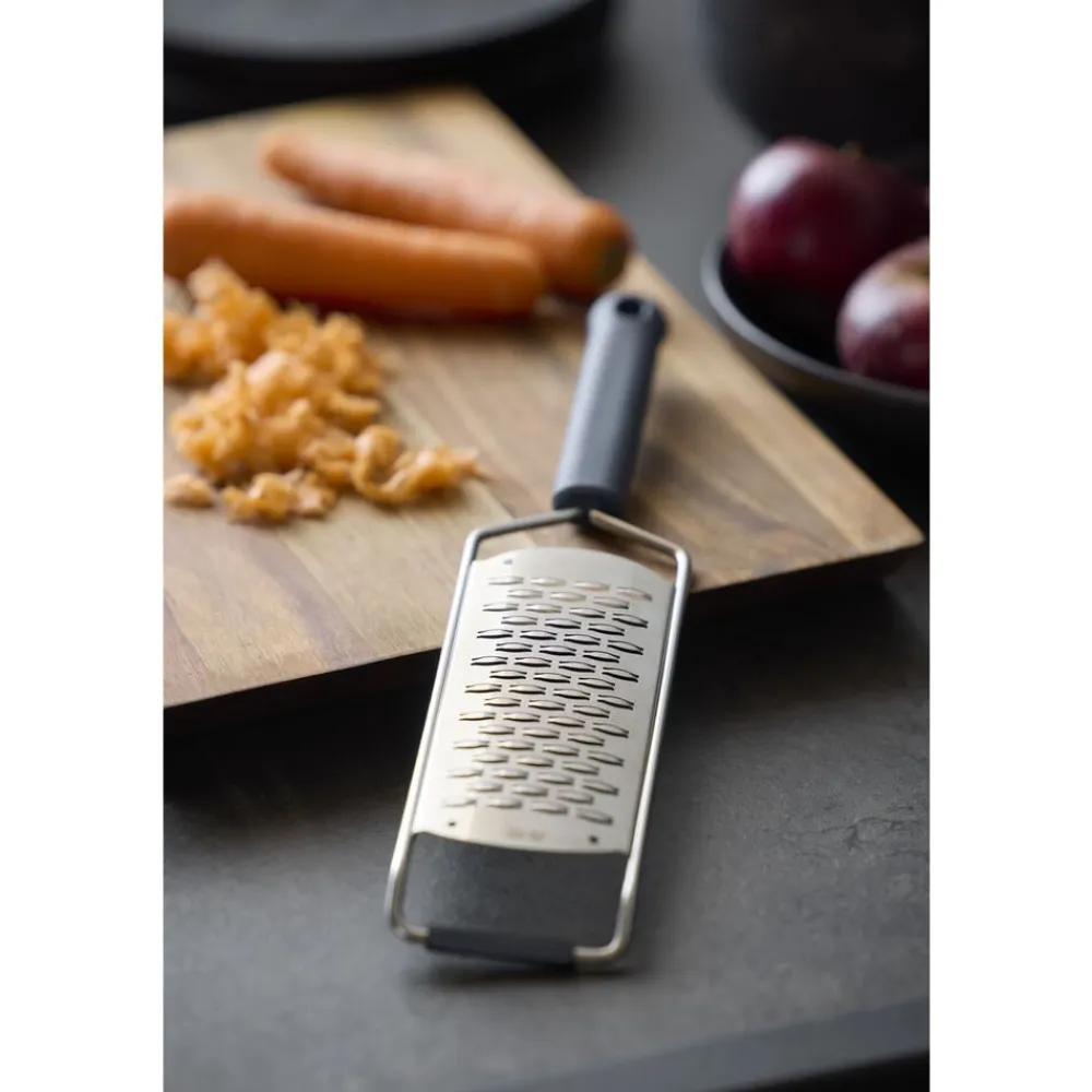 Groft rivejern i rustfrit stål med håndtag af hård plast og silikonestøtte i toppen af rivejernet. Ideelt til rivning af de fleste grøntsager, f.eks. agurk, kartofler, løg, gulerødder og andre rodfrugter samt chokolade, ost og lignende. Skæret er utroligt skarpt, og designet på skærebladene gør det muligt for dig rive i begge retninger.