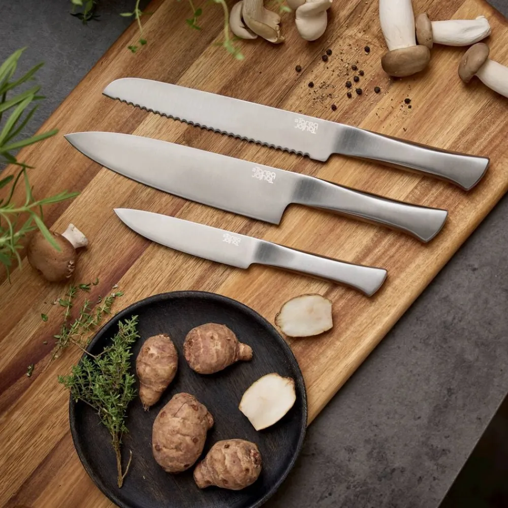 Knivsæt bestående af urtekniv 9 cm, brødkniv 20 cm og kokkekniv 20 cm.