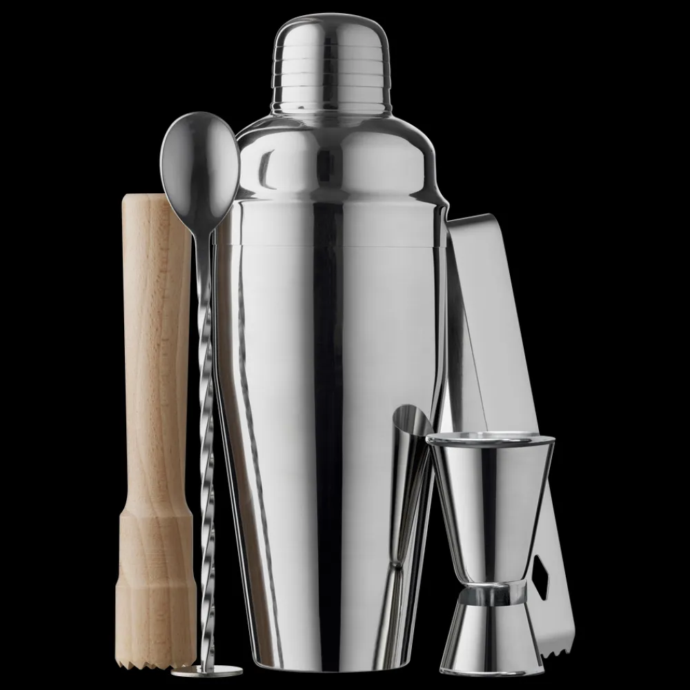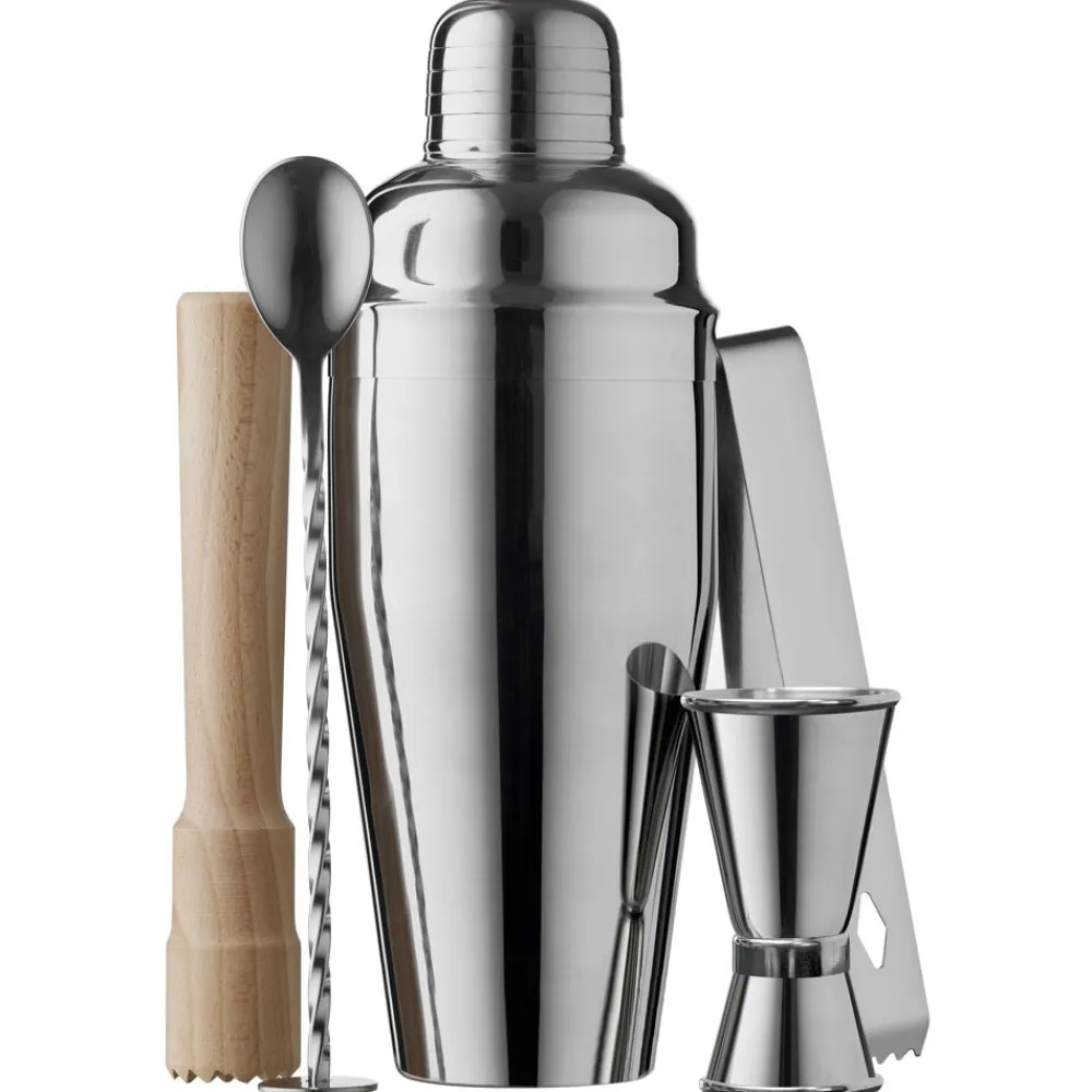 Lækkert barsæt i rustfrit stål og bøgetræ. Sættet indeholder 700 ml shaker, 19,5 cm røreske, 2/4 cl dobbelt målebæger og istang i rustfrit stål samt 15,6 cm støder i bøgetræ. Ståldelene kan vaskes i opvaskemaskine, mens støderen skal håndopvaskes.