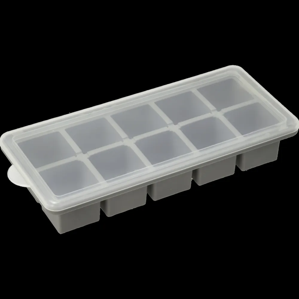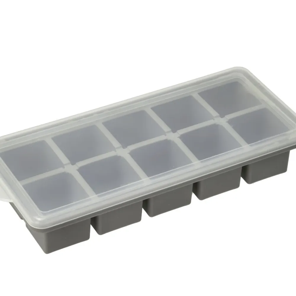 Isterningebakken er af silikone med en stabiliserende metalkant og har låg af plast. Den har plads til 10 isterninger af hver 35 ml væske.