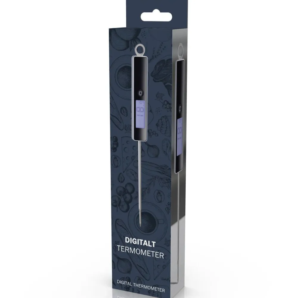 Smart og enkelt digitalt termometer med LCD display. Kan bruges til mange forskellige opgaver i køkkenet, også til bolcher. Greb i plast og temperaturspyd i stål. Måler temperaturer imellem -20 og +300 C.