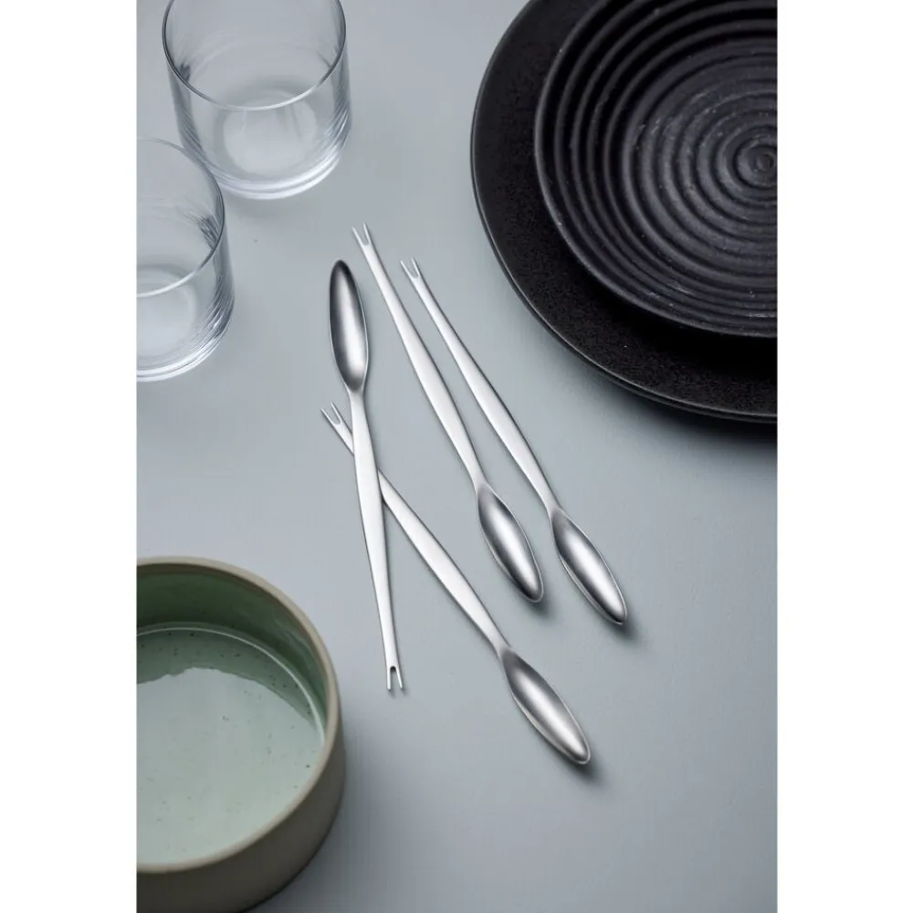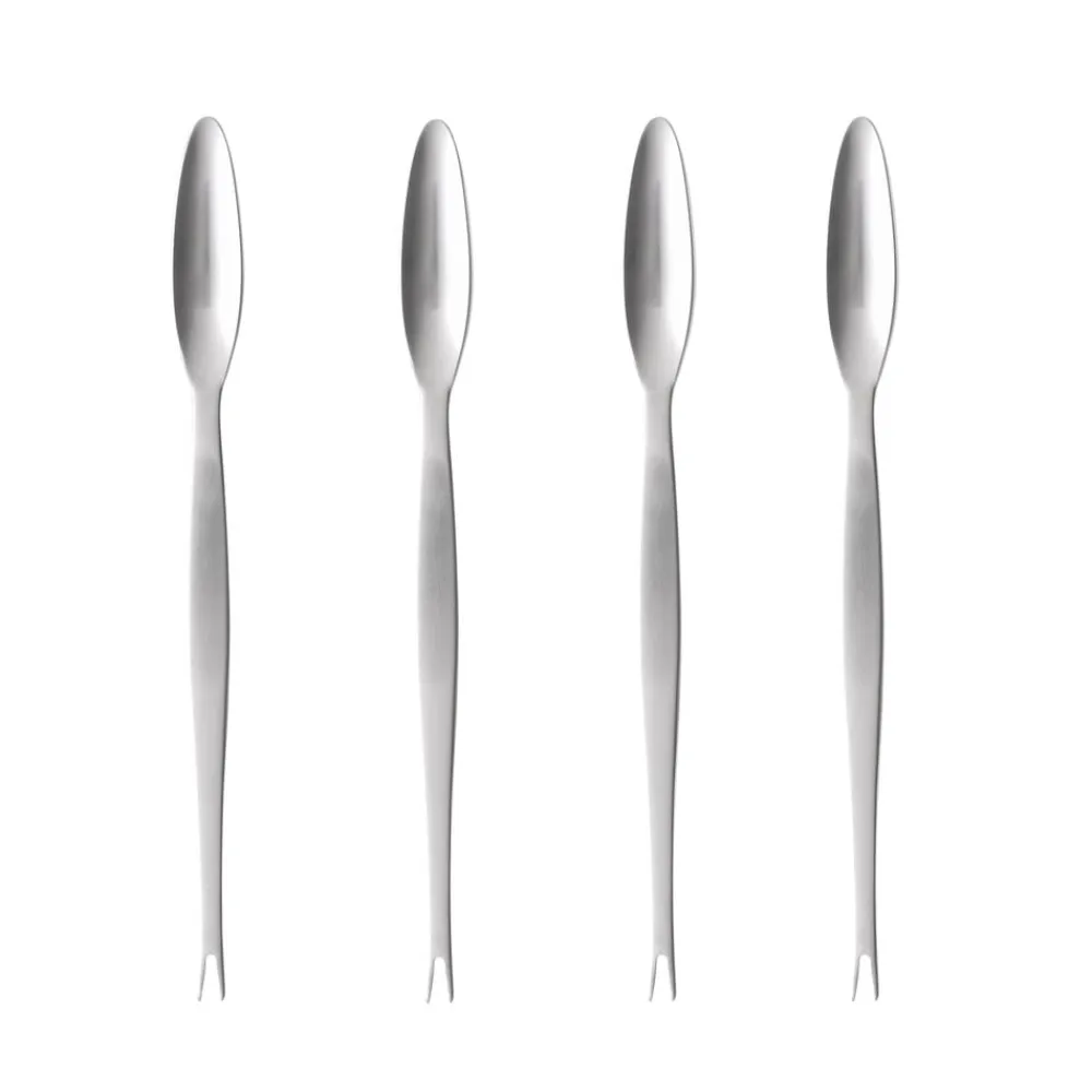 En klassisk skaldyrsgaffel med to tænder og ske i den anden ende, der gør det nemt at pille skaldyrskødet ud af kløer m.m. Tåler opvaskemaskine.