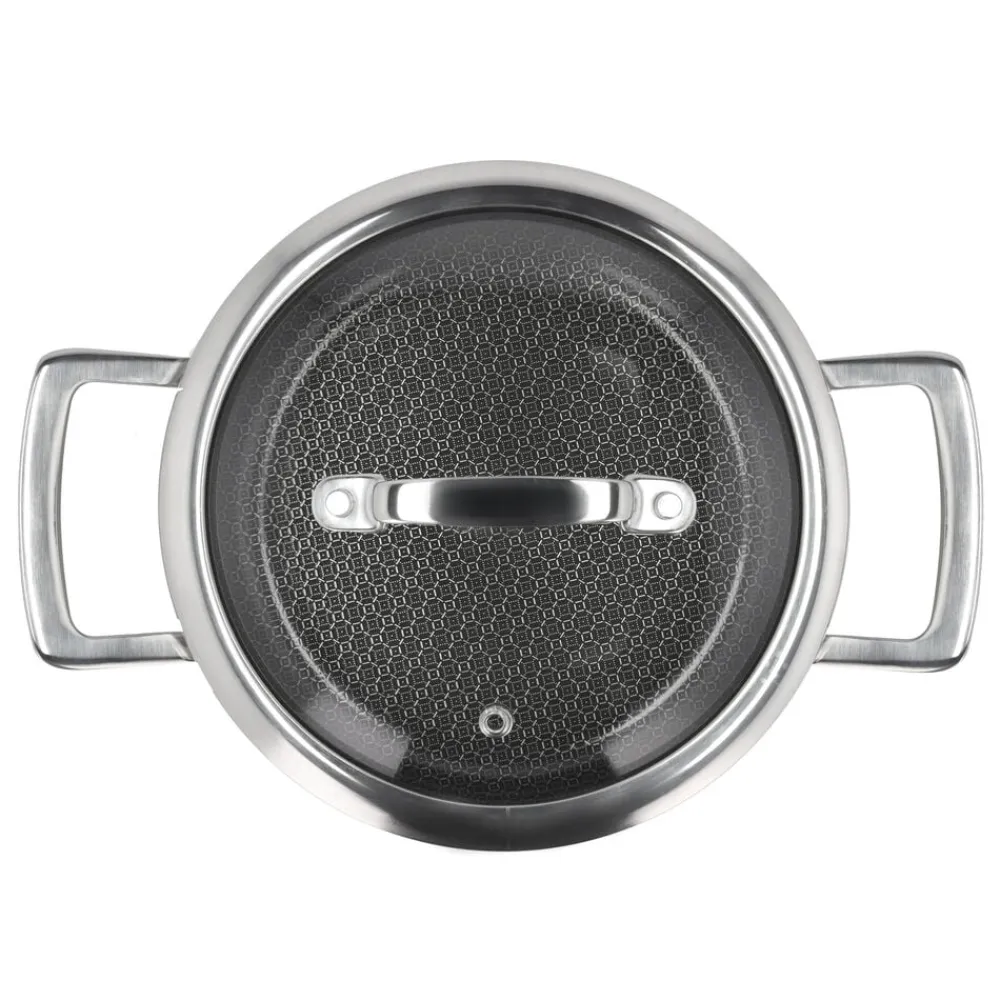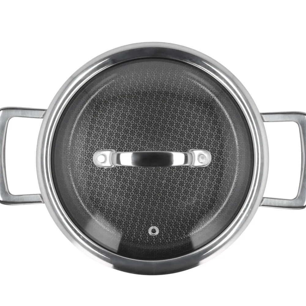 Hybrid 3ply-serien er fremstillet af rustfrit stål med keramisk hybrid-belægning, der sikrer gode stegeegenskaber og let rengøring. Bemærk, at 3-ply-konstruktionen med sin struktur af to lag rustfrit stål og et lag aluminium i midten, opvarmes meget hurtigt. Vær derfor forsigtig med ikke at overophede, men varm gryder og pander langsomt op.