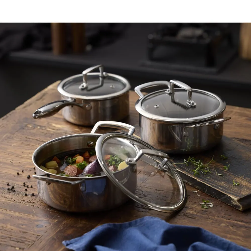 Grydesættet indeholder en kasserolle på 1,2 liter samt gryder på 2 og 2,7 liter, alle med låg.
