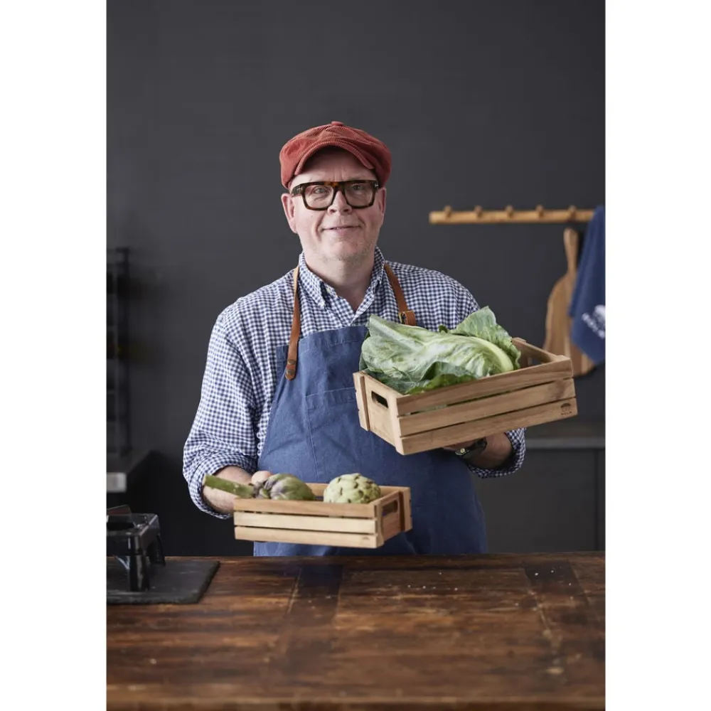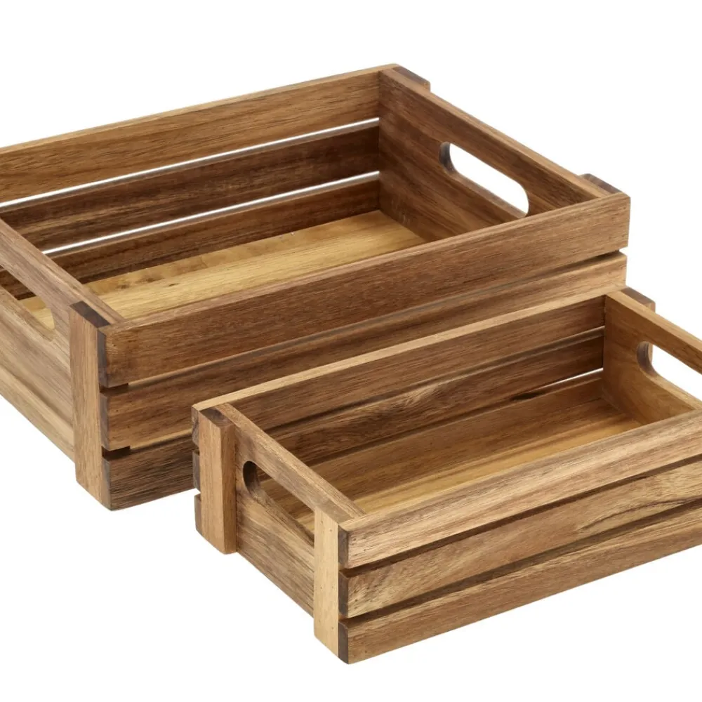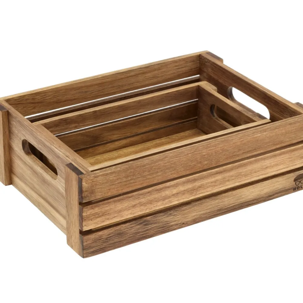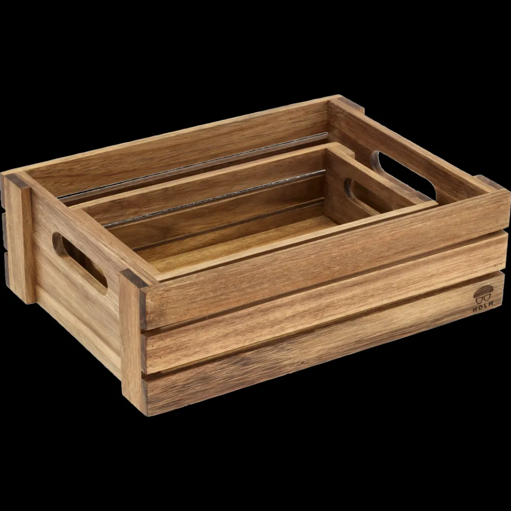 Du kan bruge de flotte trækasser i to størrelser til opbevaring af mange forskellige ting, f.eks. olier, krydderier og krydderurter i køkkenet, til køkkenredskaber eller servietter. Akacietræet med de smukke åretegninger kan med fordel efterbehandles med smagsneutral olie et par gange om året. Den lille kasse måler 26 x 14 x 7 cm, og den store måler 32 x 23 x 10 cm. Kasserne tørres over med en fugtig klud og må ikke vaskes i opvaskemaskine.