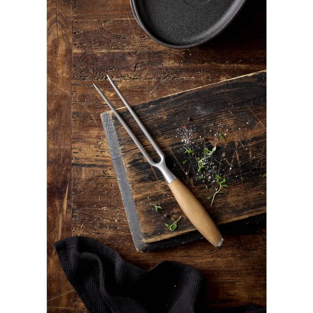 Knivsættet indeholder fem lækre knive – universalkniv 24 cm, santokukniv 31 cm, filetkniv 33 cm, kokkekniv 33 cm, brødkniv 33 cm – og en stegegaffel 29 cm. De flot rundede skafter, der ligger behageligt i hånden, er af akacietræ med virkeligt smukke og karakteristiske åretegninger og er afsluttet med en elegant stålkappe for enden af skaftet. Bladene er af rustfrit stål i høj kvalitet. Knivene skal vaskes i hånden med varmt vand og sæbe, også før første brug.