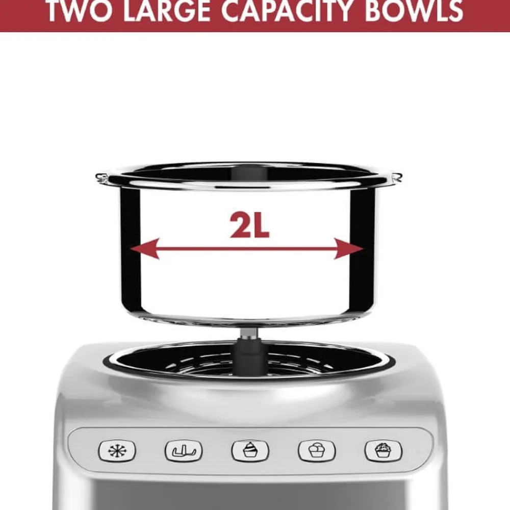 Gelato Expert har to 2L rustfri stålskåle – én aftagelig og én fast, til isproduktion i to omgange. Når din is er klar, kan den opbevares ved optimal temperatur og konsistens i op til 2 timer med opbevaringsfunktionen.