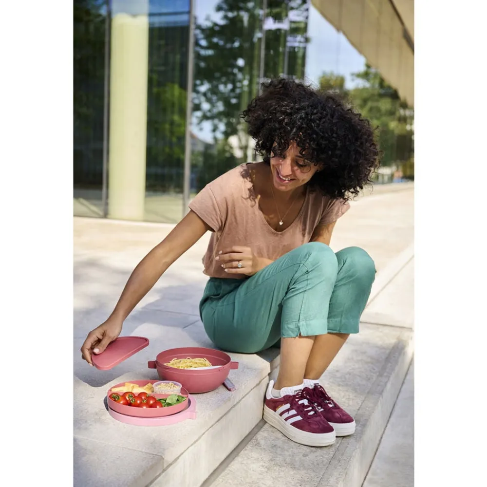 Vita frokostboks holder den medbragte mad frisk, smagfuld og adskilt. Kan bruges til sandwiches, salater, pasta, frugt og lignende. Det gennemsigtige låg er luft- og lækagetæt. Frokostboksen er bentoopdelt og indeholder blandt andet et minibæger til f.eks. dressing eller nødder samt bakke til eksempelvis foldbart bestik eller køleelement. Boksen rummer 1500 ml (1000 + 500 ml). Kan vaskes i opvaskemaskine og anvendes i mikroovn. Fremstillet i Holland.