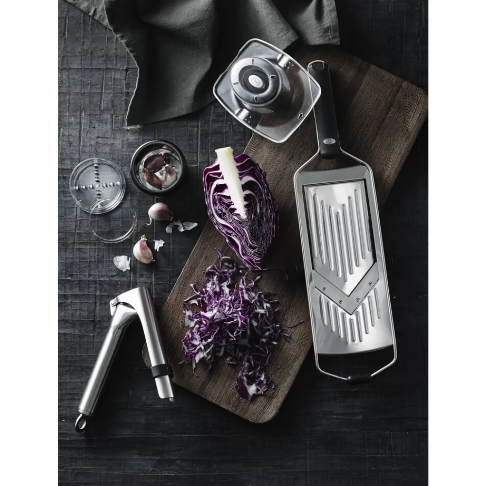 Hvidløgspresserens sigte med koniske huller garanterer et perfekt presset resultat. Selv upillede hvidløgsfed kan presses – faktisk kan selv ingefær presses. Sigten kan nemt foldes ud og rengøres under rindende vand. Hvidløgspresserens design er stramt og klassisk, og ophængsringen sikrer nem opbevaring.