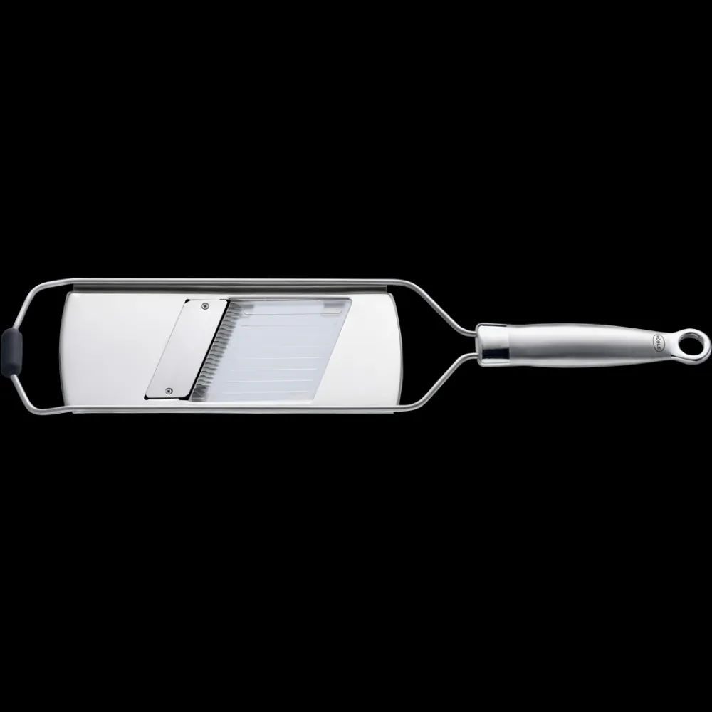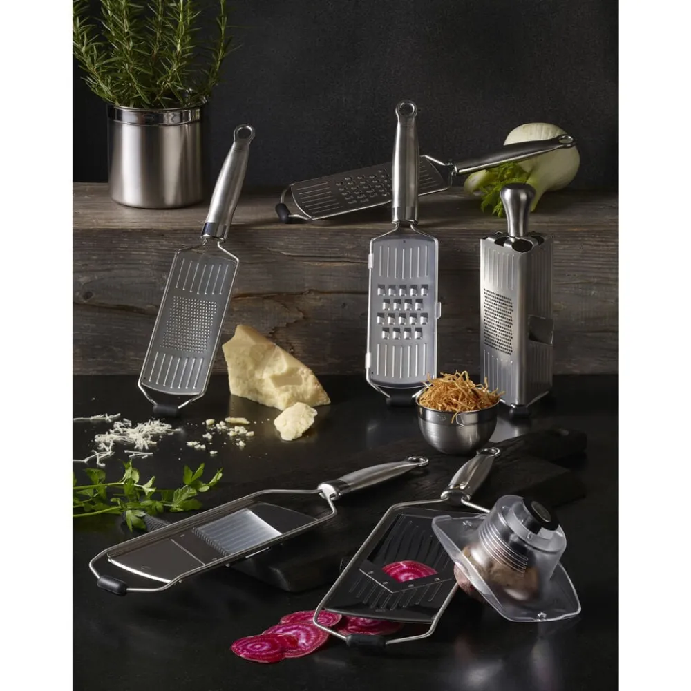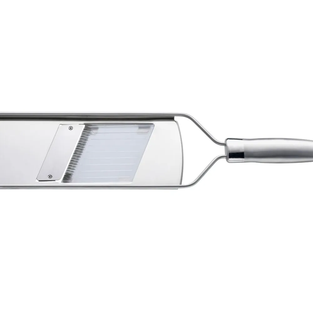 RÖSLE juliennejern til at skære grøntsager i flotte julienne-strimler – perfekt til supper, salater og wokretter. Du kan nemt ændre strimlernes størrelse ved at udskifte snittepladen, hvor der medfølger 3 forskellige.