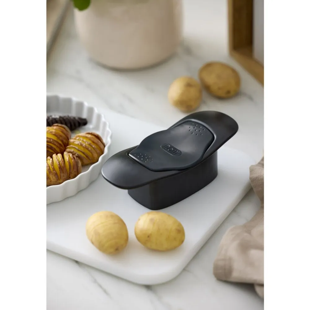 Hasselback-skæreren fra Rosti er et hurtigt og effektivt redskab til at skære skarpe og regelmæssige riller i kartofler og andre rodfrugter. Uanset om du forbereder klassiske Hasselbackkartofler eller eksperimenterer med grøntsager som pastinak eller tomat, opnår du nemt hurtige og imponerende resultater.