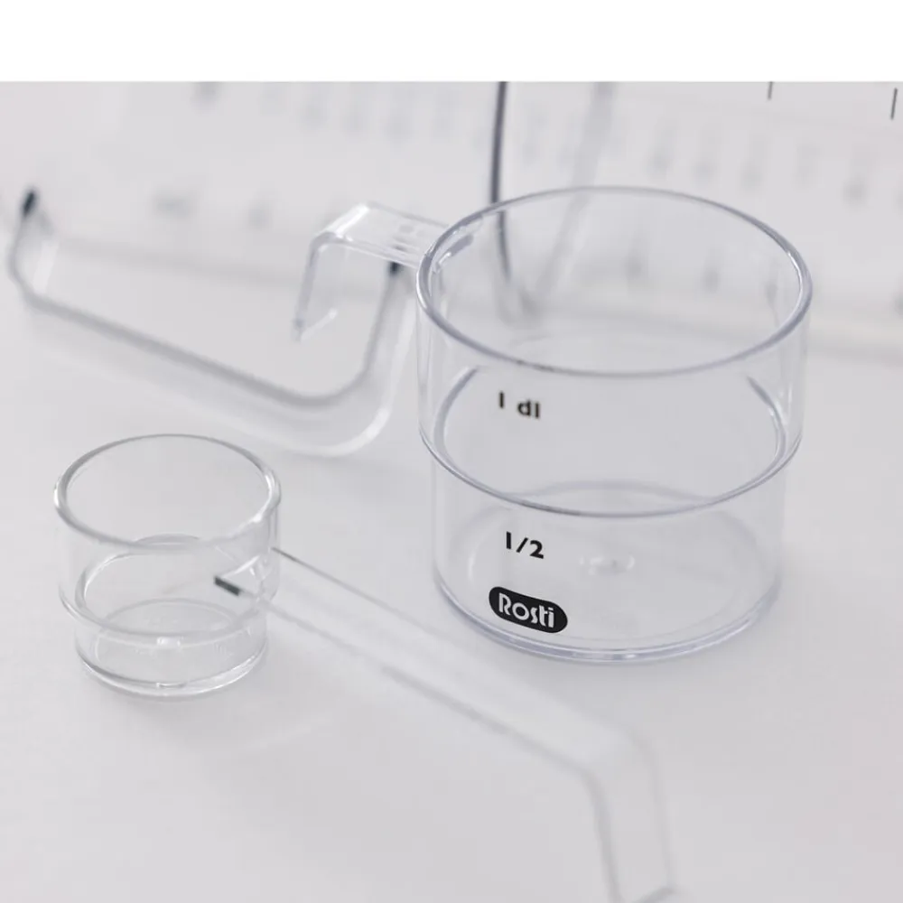 Mensura decilitermålet har et markant design med en tydelig markering midtpå, som angiver en halv deciliter. Den samme markering i formgivningen gør det nemt at stable flere målebægre. Håndtaget giver et godt og sikkert greb.