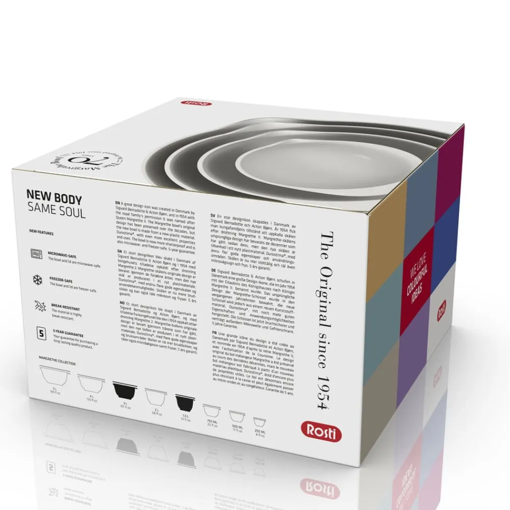 Margrethe-skålen er designet for Rosti af Sigvard Bernadotte og Acton Bjørns tegnestue i København og i 1954 med kongehusets tilladelse opkaldt efter dronning Margrethe 2. Skålen fås i et væld af flotte farver i hele 8 forskellige størrelser. Velegnet til opvaskemaskine, mikroovn og fryser.
