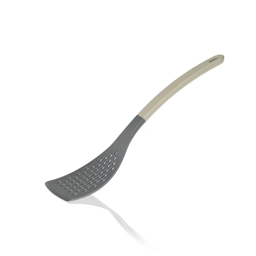 Stor palet med farvet skaft. 31 cm. Bladet er perforeret, og med en bredde på 8,5 cm er paletten velegnet til at håndtere større fødevarer på panden, såvel kød som grøntsager. Fremstillet i nylon, der er skånsomt mod gryder og pander med belægning og tåler varme op til 220 grader C. Slankt og ergonomisk design med praktisk ophængshul. Velegnet til opvaskemaskine.