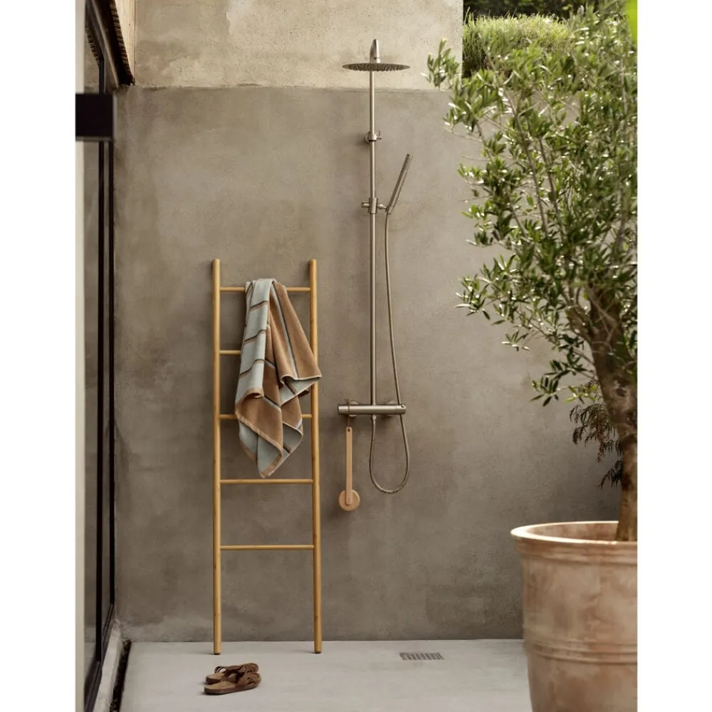 Sauna er navnet – og striberne taler for sig selv. Serien er inspireret af de stramme linjer i en klassisk træbeklædt sauna, hvor designet leger elegant med perspektiv og farvebalance. Hver side af håndklædet fremhæver sin egen dominerende farve – en fin detalje, der giver dig to forskellige udtryk i ét og samme håndklæde