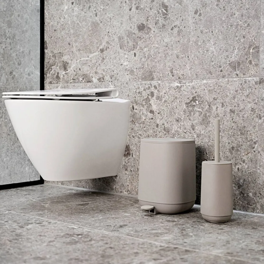 TIME badserien får dig til at kigge en ekstra gang. Tre af seriens fire produkter – nemlig sæbedispenser, tandbørstekrus og toiletbørste – er udført i beton og blot suppleret med få plast-detaljer. Pedalspanden er derimod ren ABS-plast, men matcher beton-produkterne farvemæssigt, så serien fremstår som én stærk helhed. Beton er kendt for sin kompromisløse karisma og naturlighed og har de senere år vundet indpas i boligindretningen. Det er på én gang hårdt, blødt og meget smukt. Endelig er det et lidt mere energibesparende materiale end fx keramik, da det ikke skal brændes ved høj temperatur.