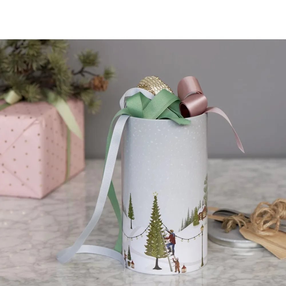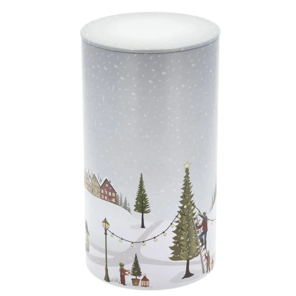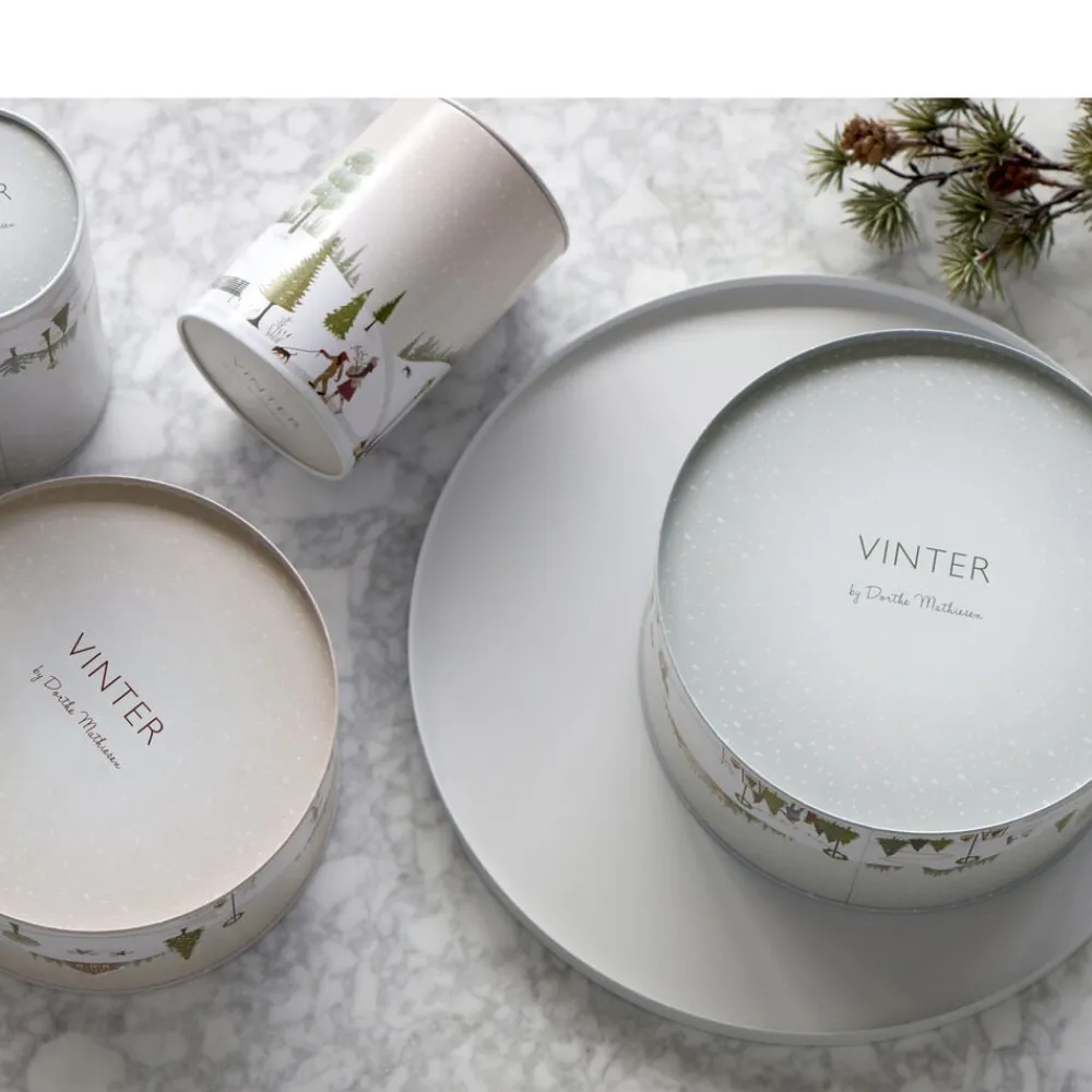 Kagedåse af metal med eventyrlige vintermotiver. Serien Vinter er skabt i samarbejde med designer Dorthe Mathiesen. Hendes motiver med den karakteristiske grafiske streg og lyse, nordiske pastelfarver afspejler stemningen i de hyggelige vintermåneder og fortæller historier fra de små samfund om leg i sneen, stemningsfulde vinterlandskaber og samvær med familie og venner, som beskueren kan hoppe ind i og selv bygge videre på.