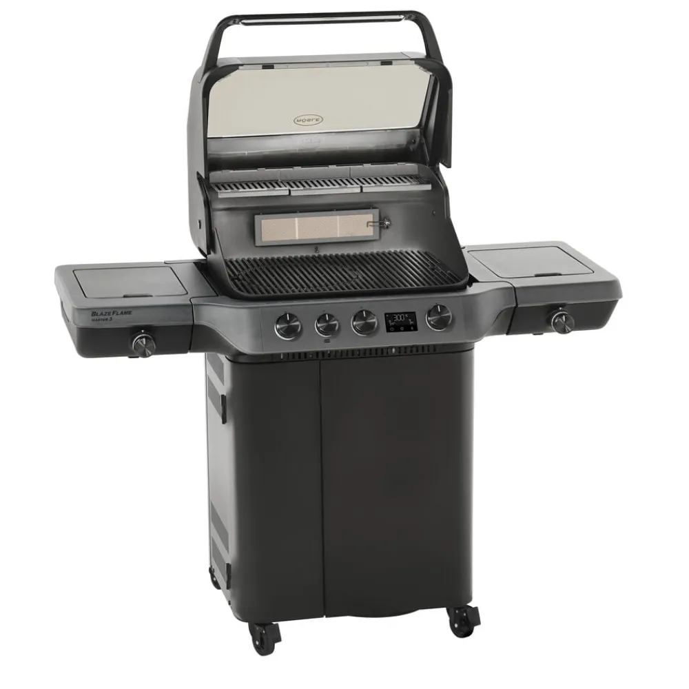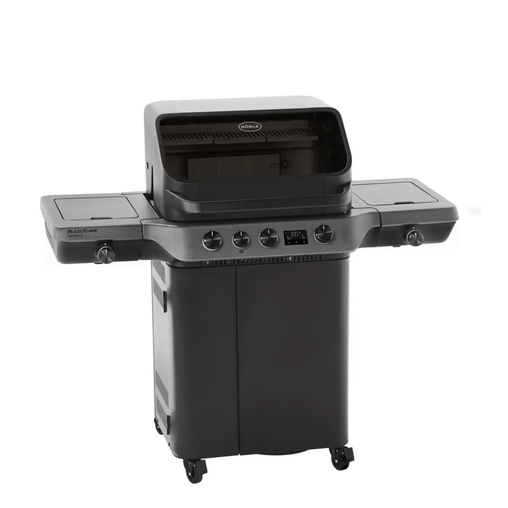 Blazeflame Master 3 er en kraftfuld gasgrill med tre imponerende gasbrændere (hver 4,0 kW), som nemt kan opnå høje temperaturer på grillristen i emaljeret støbejern. Grillen har et grillområde på 60 × 48 cm og tre justerbare opvarmningshylder. Opvarmningshylderne kan rengøres i opvaskemaskinen, og grillens smarte fedtopsamlingssystem med tre opsamlingsbakker sikrer nem og hygiejnisk rengøring. Opsamlingsbakkerne kan også rengøres i opvaskemaskinen. Brandkammeret er fremstillet i støbt aluminium, hvilket sikrer en optimal varmeeffektivitet og gør rengøringen ekstra nem. De tre brændere er samlet i én enhed, der nemt kan fjernes, når grillen skal rengøres. Der ydes 10 års garanti på brandkammeret.