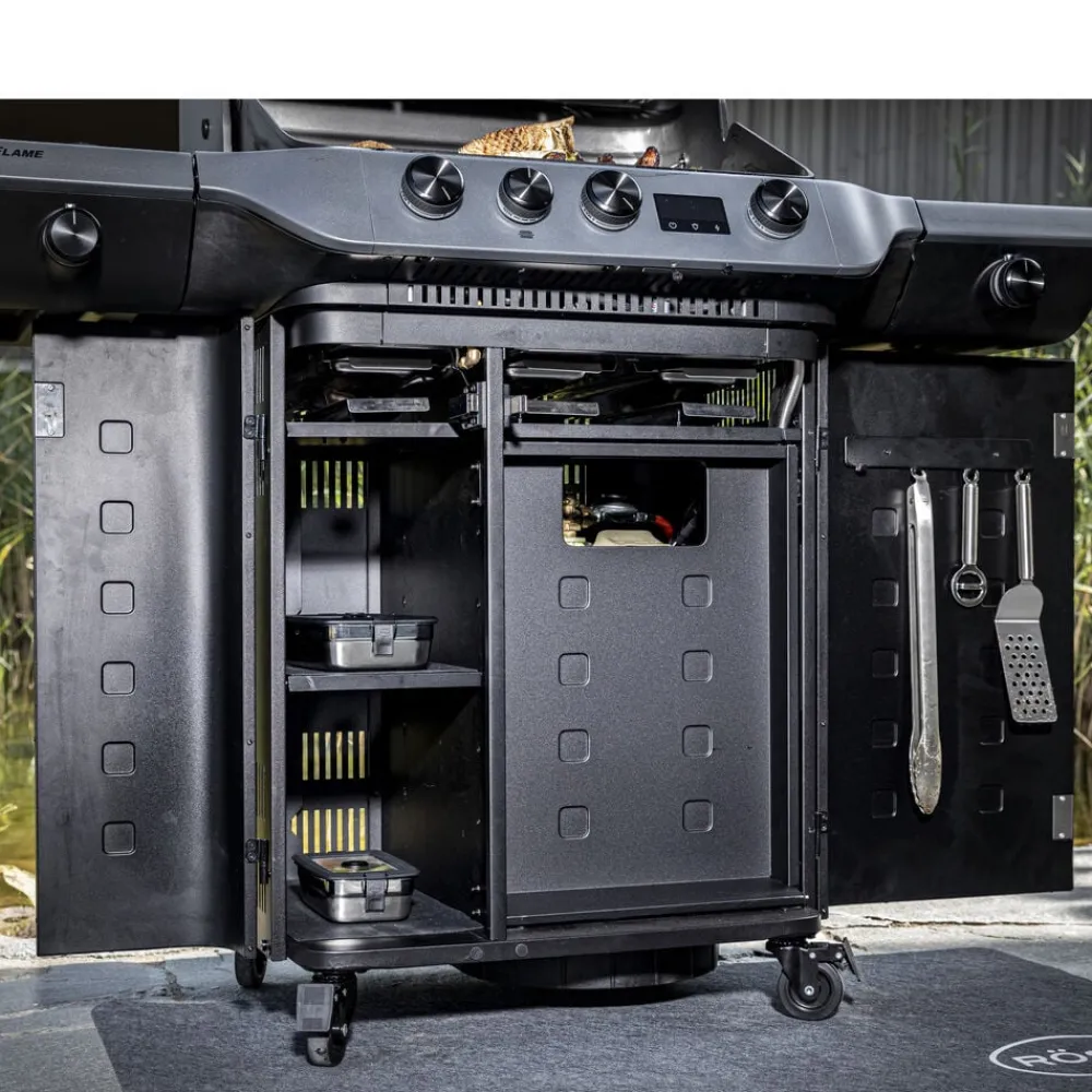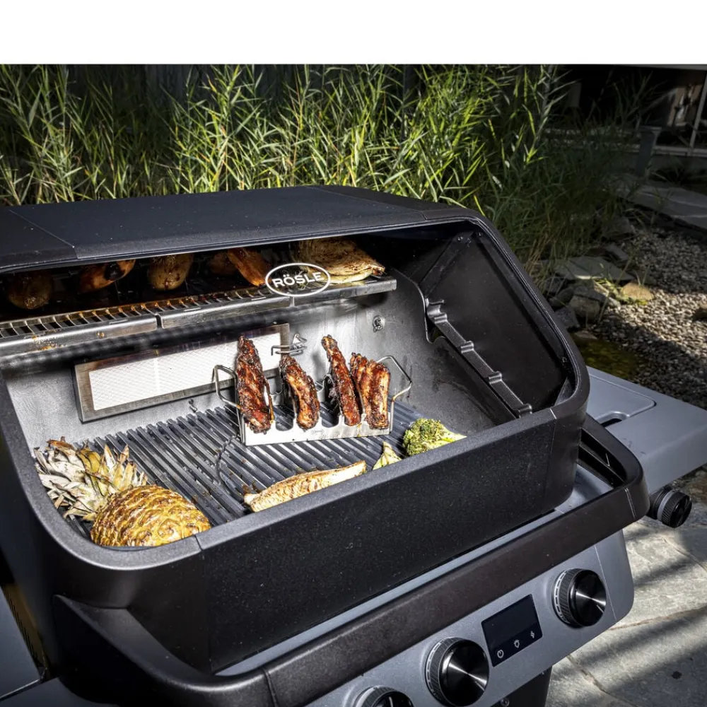 Blazeflame Master 3 har et stort panoramavindue med integreret lys, så du kan følge med i tilberedningen uden at åbne låget. De foldbare sideborde sparer plads, når grillen ikke er i brug, og de oplyste drejeknapper i to farver gør betjeningen intuitiv – selv efter mørkets frembrud. XXL-primezone med en ekstra kraftfuld og integreret sidebrænder (hele 5,0 kW) i det venstre sidebord når op til 800 °C, ideelt til lynstegning og intens varme. En praktisk kogeplade (3,5 kW) i det højre sidebord gør det nemt at tilberede saucer og tilbehør. Infrarød bagbrænder (3,6 kW) ideel ved brug af rotisseri.