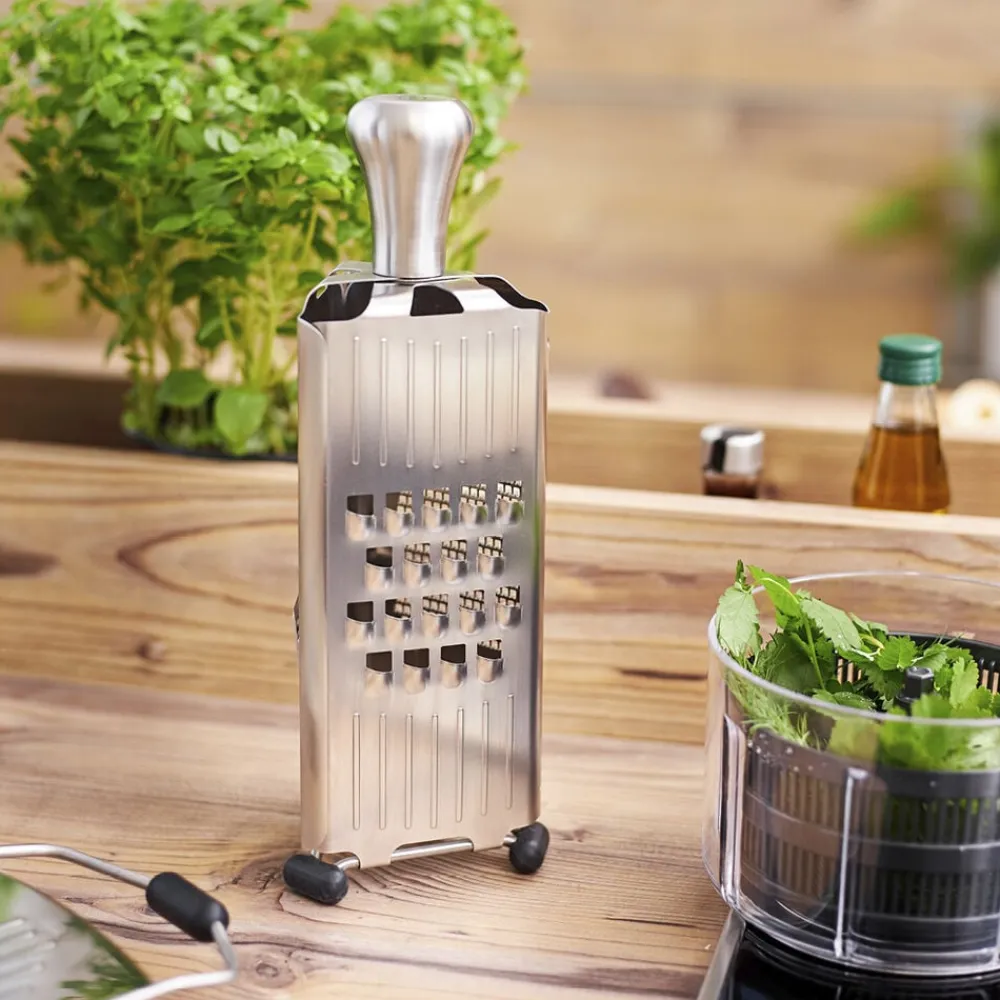 Kompakt multirivejern til at rive og snitte alt hvad, du kan tænke dig og som samtidig er let at gemme væk i skuffen. Multirivejernet kombinerer fint, groft samt snittejern i et køkkenredskab til mange formål, fx at rive parmesan, rive kartofler samt at snitte gulerødder m.m. Skæreoverfladen kan fjernes for rengøring. Silikone-fødderne sikrer, at du kan arbejde uden at rivejernet rykker sig på bordet. Inklusiv beskyttende etui.