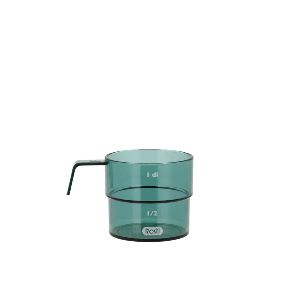 Mensura decilitermålet har et markant design med en tydelig markering midtpå, som angiver en halv deciliter. Den samme markering i formgivningen gør det nemt at stable flere målebægre. Håndtaget giver et godt og sikkert greb.