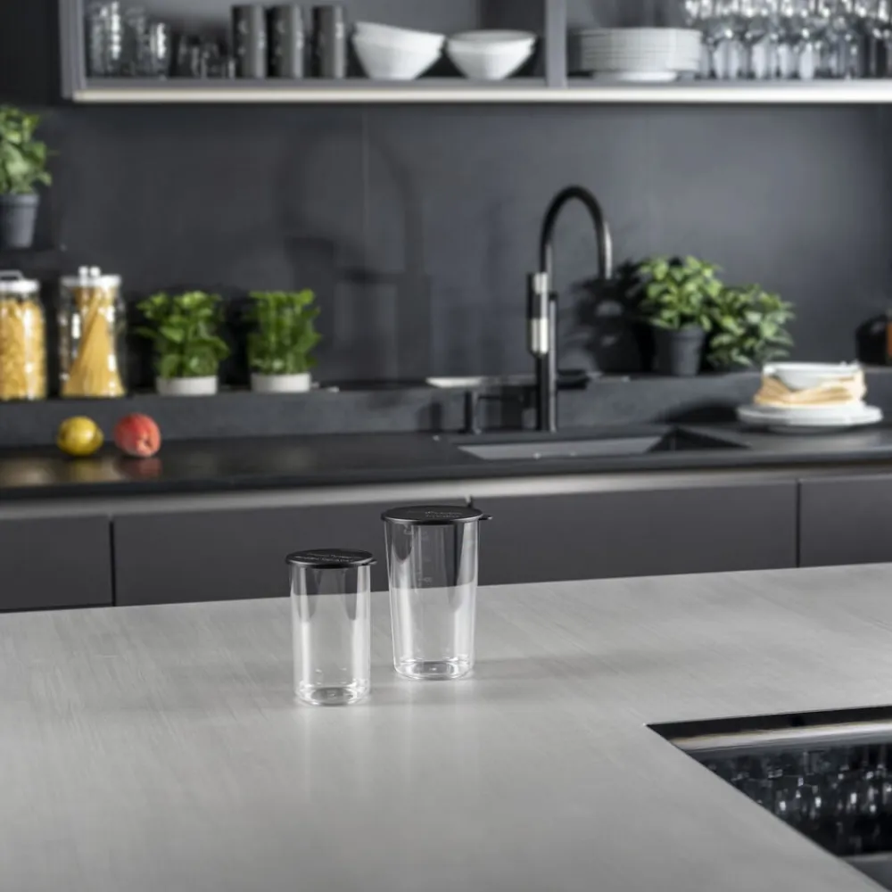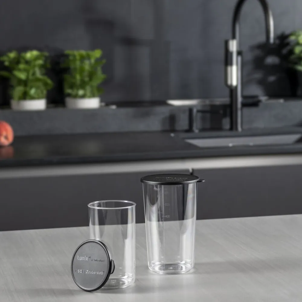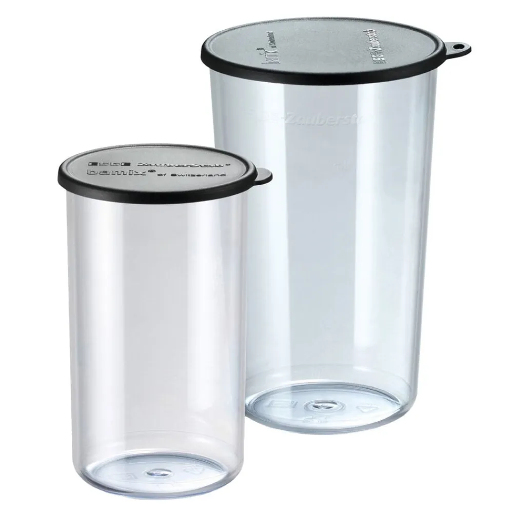 bamix®-sæt med 2 mixebægere med låg, 400 og 600 ml. Formen er designet til brug sammen med en bamix®-stavblender. Materialet er stødsikkert, modstår ridser og er varmeresistent op til 80-100 grader. Kan bruges i fryseren.