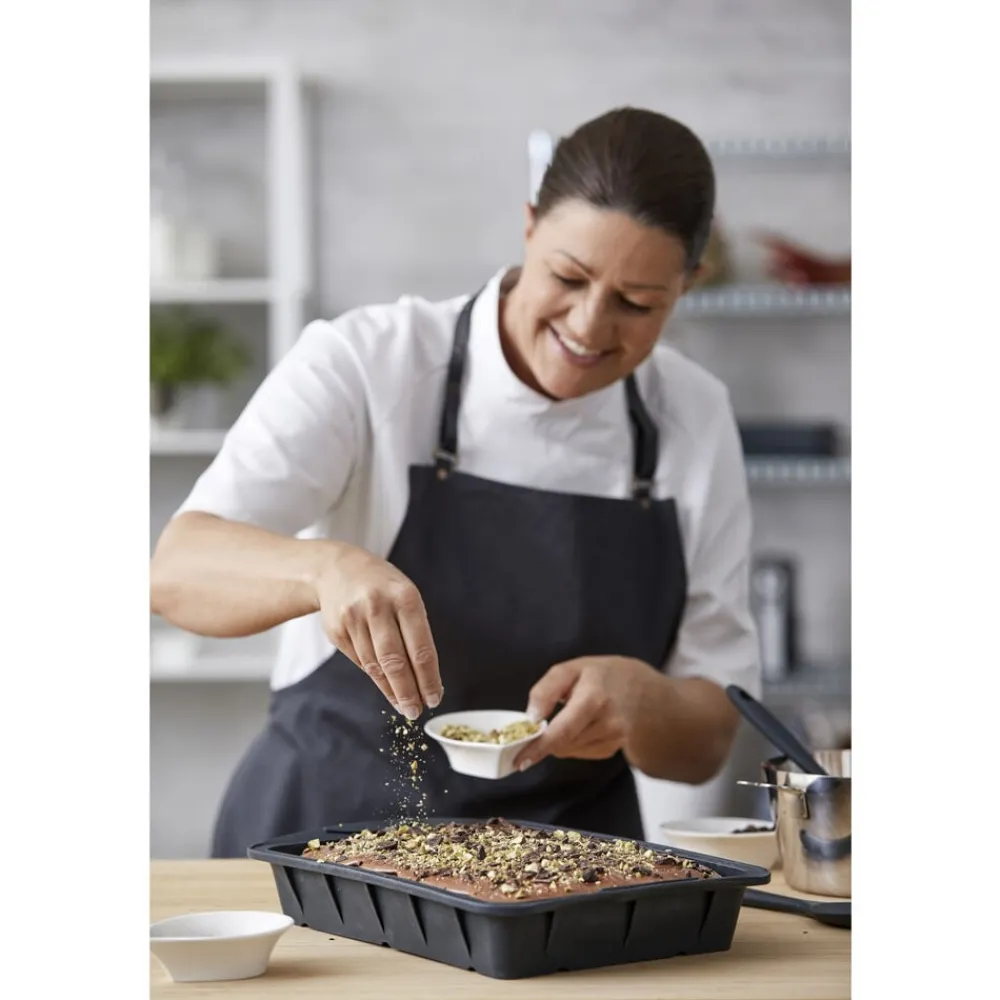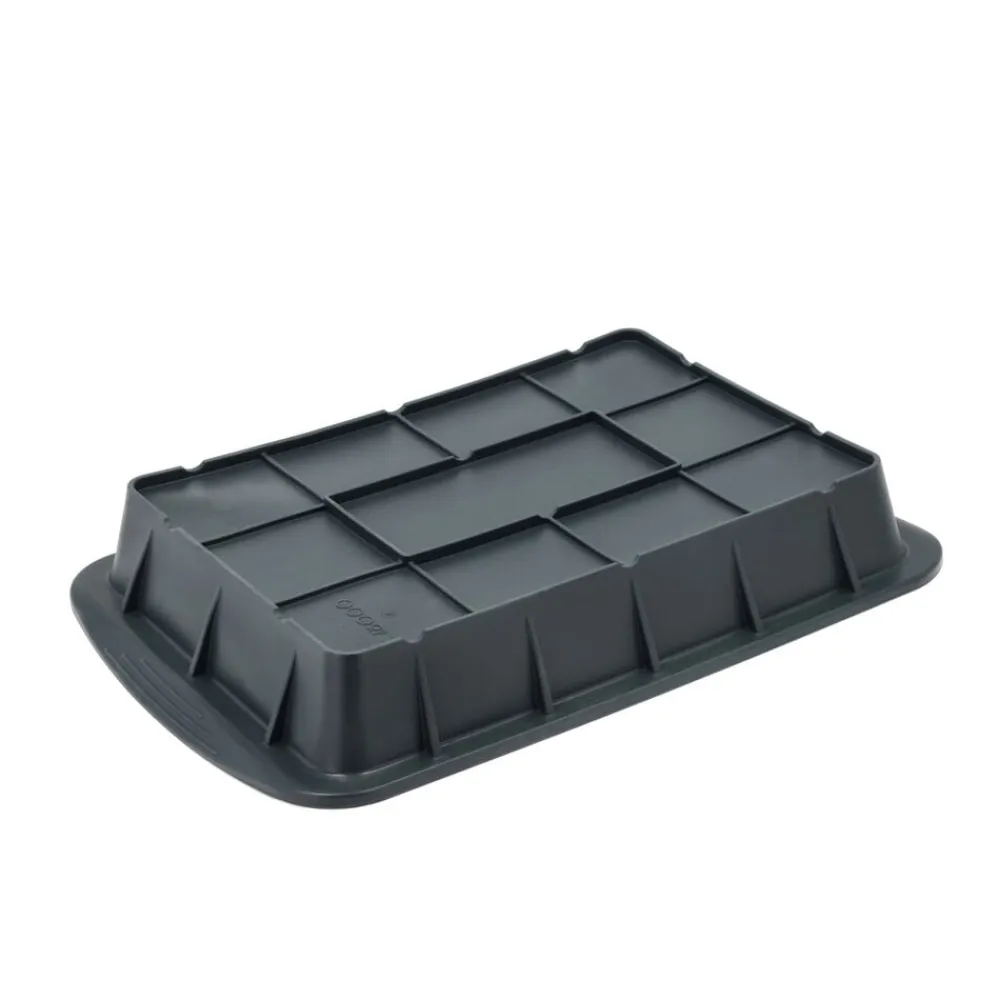 Stor rektangulær bageform i grå silikone med stabiliserende stålkant. Perfekt til de lækre, klassiske bradepandekager, som du vil forkæle familien, klassen og vennerne med. Formen kan også anvendes til brød eller i det salte køkken til fx lasagne. 39 x 25 x 6 cm.