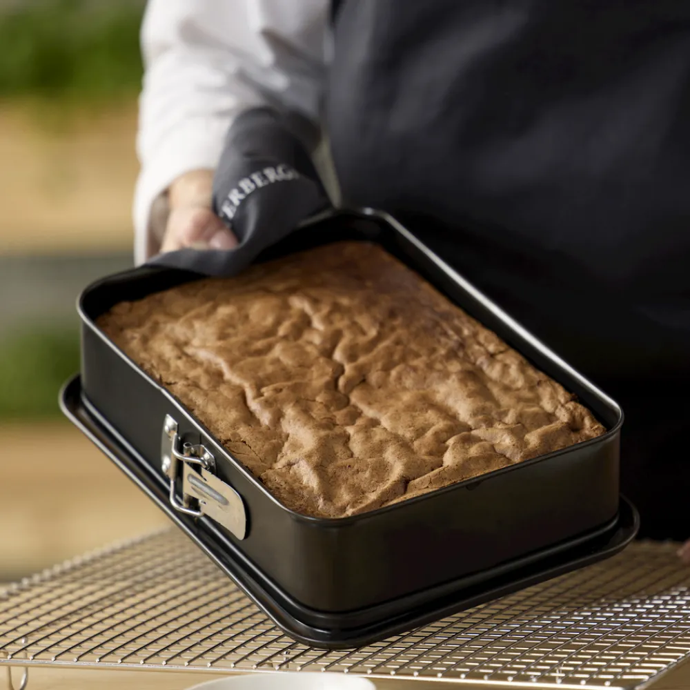 Rektangulær springform i let stål med non-stick belægning. Anvendes til alle slags bagte rørekager som fx chokoladekage, til lækre brød og tykke lagkage- og dessertbunde. Smør formen indvendigt ved bagning. Vaskes i opvaskemaskine før første brug. Den keramiske belægning er fremstillet af råvarer, der ikke indeholder PFAS.