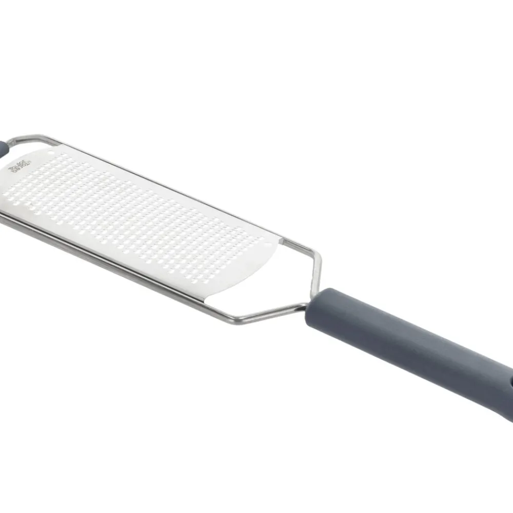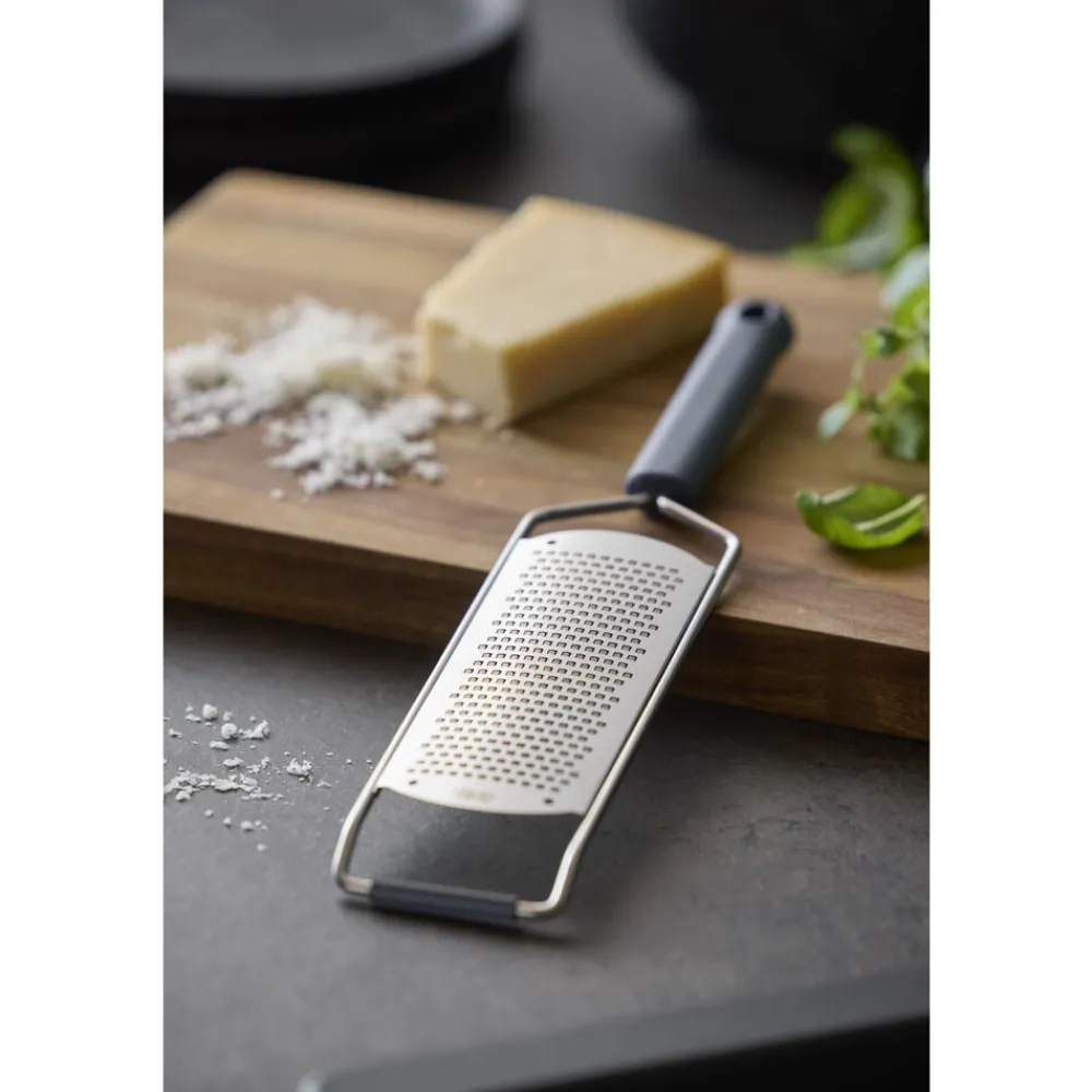 Fint rivejern i rustfrit stål med håndtag af hård plast og silikonestøtte i toppen af rivejernet. Rivejernet er oplagt til rivning af for eksempel parmesanost og citrusskal.