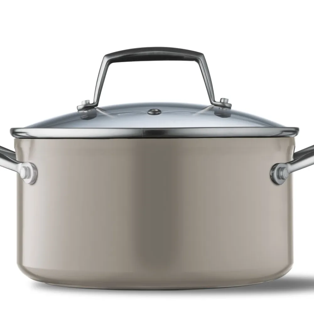Gryde fremstillet af støbt aluminium, som sikrer, at varmen fordeles og fastholdes jævnt og effektivt over både bund og sider. Gryden har en tolags keramisk belægning med non-stick-funktion, er velegnet til alle varmekilder, tåler op til 220 grader C i ovnen og kan gå i opvaskemaskinen. Tåler alle typer redskaber, har tilhørende glaslåg og kan indeholde 5,6 liter.