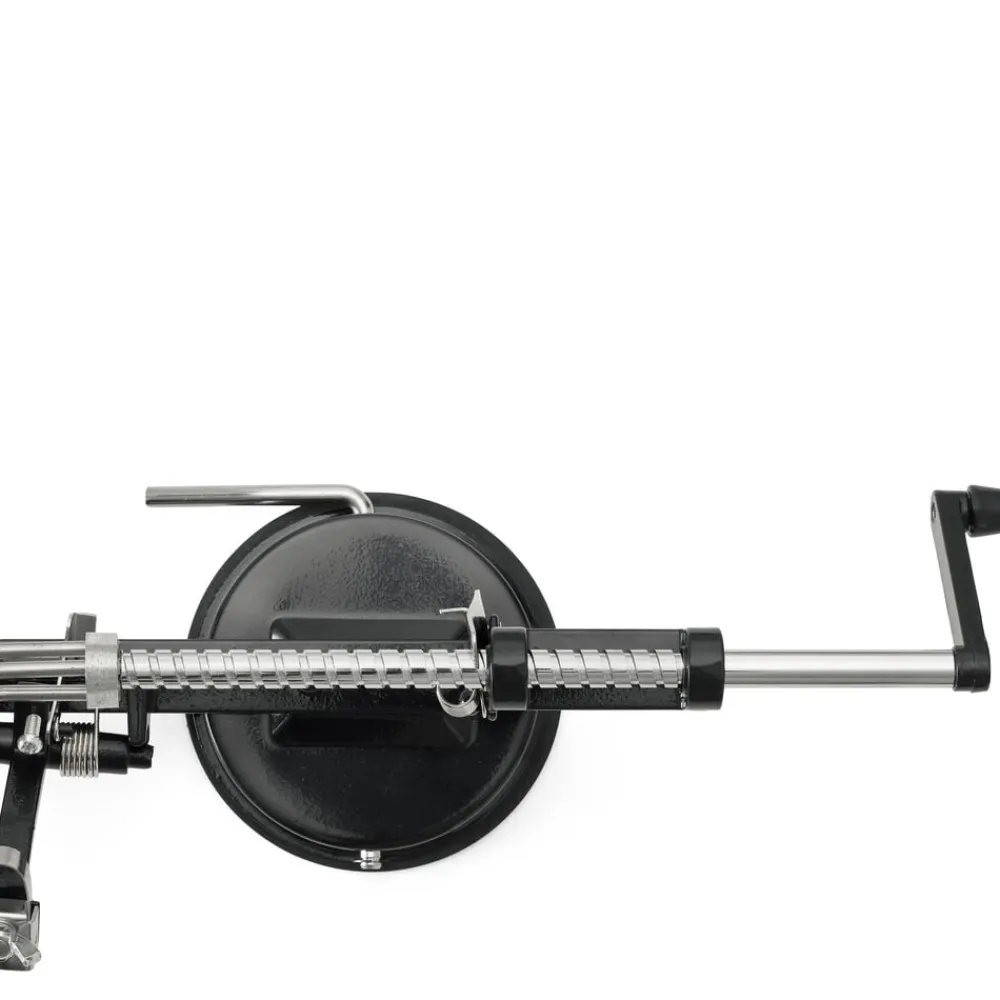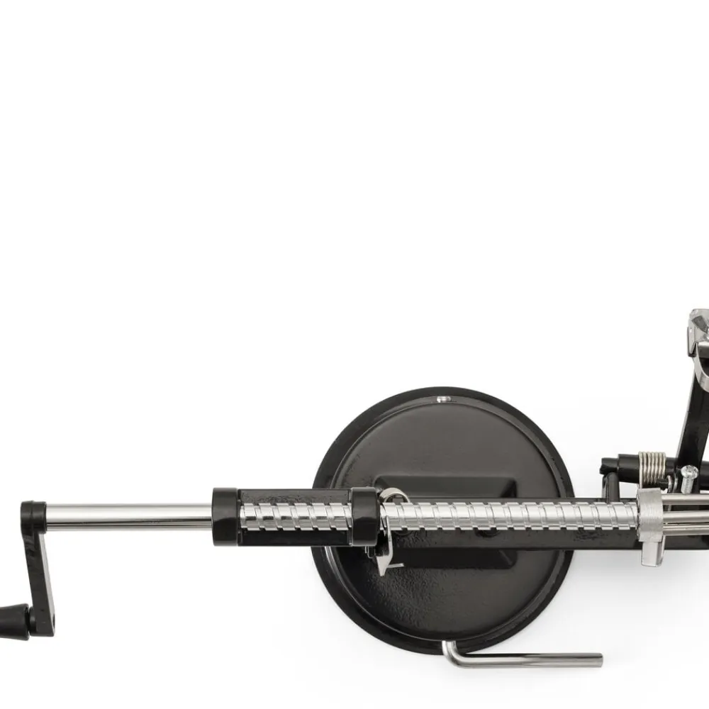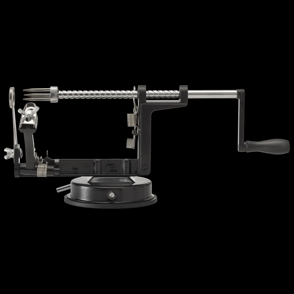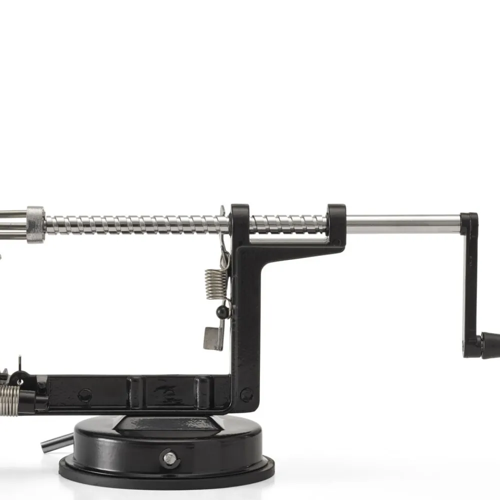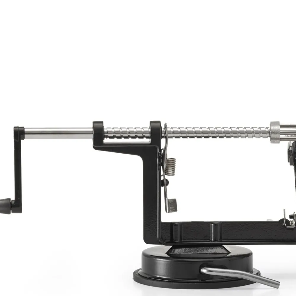 Æbleskræller med sugekop i bunden, så den står sikkert på overfladen. Æblet fastholdes på treforken, og håndtaget drejes, så æblet skrælles og deles, og kernehuset fjernes.