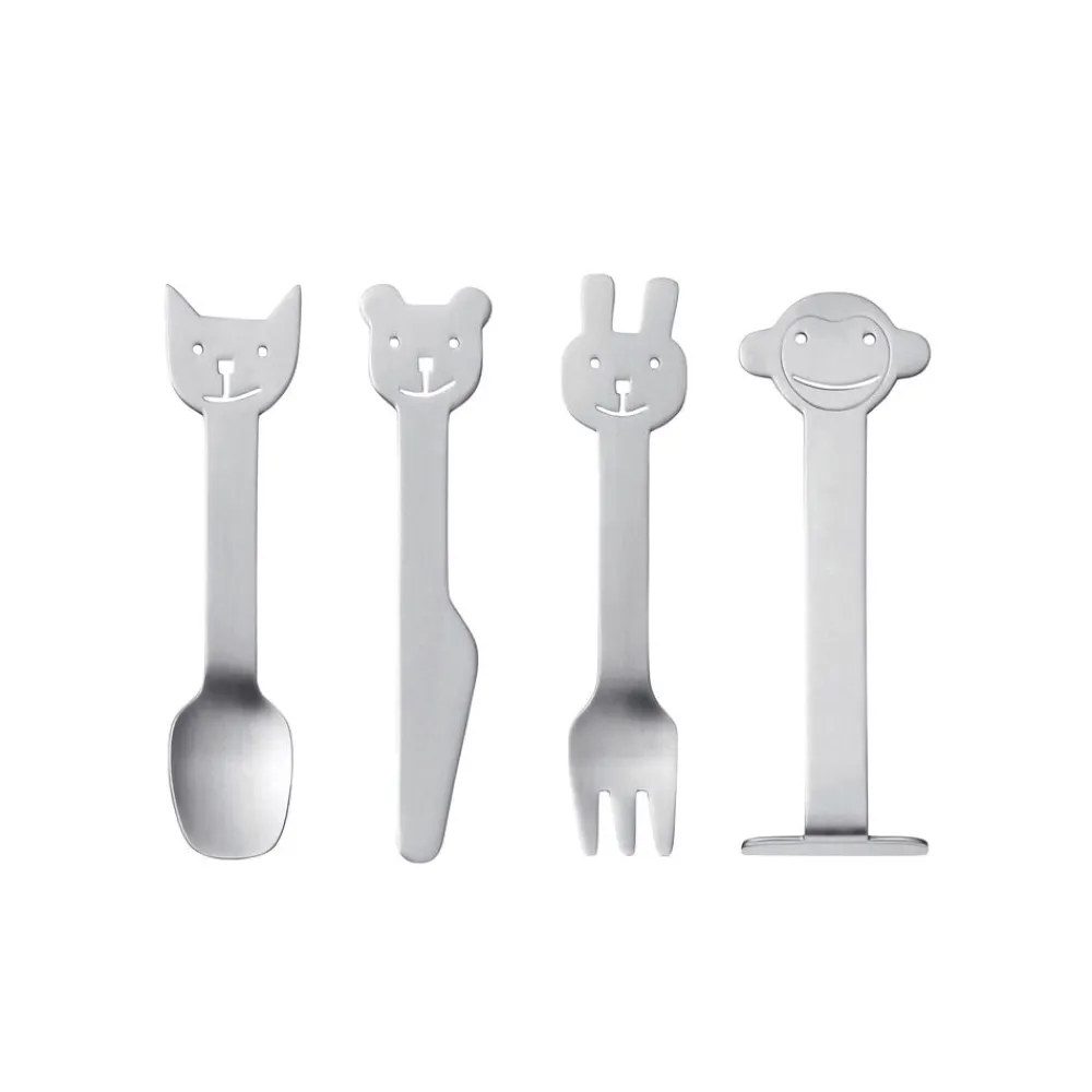 Animal Friends er et skønt børnebestik i rustfrit stål formgivet af Karin Mannerstål. Når den lille kanin, bjørn, kat og abe finder vej til spisebordet, har børnene fået venner, der er glade for at hjælpe med at gøre måltidet endnu sjovere. Perfekt egnet til børn i alderen 1-4 år. Tåler opvaskemaskine.