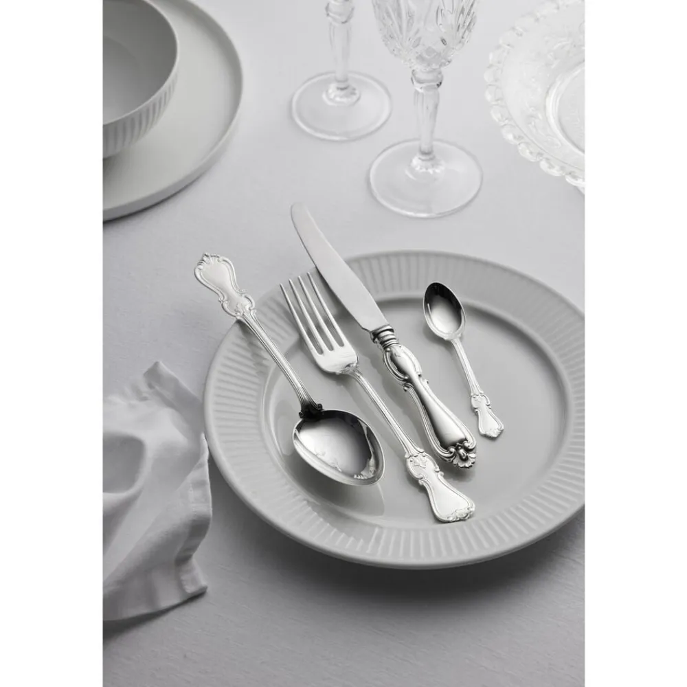 Olga har sin oprindelse i den engelske nyrokoko fra det 19. århundrede. Bestikket er designet til at passe til den tids storstilede borddækninger med krystalglas og smukt foldede servietter. Og det gør sig mindst lige så godt i dag – uanset stil og øvrige omgivelser. Med sine levende bladmønstre er det et design, der tager form og bliver noget, man snakker om rundt om bordet.