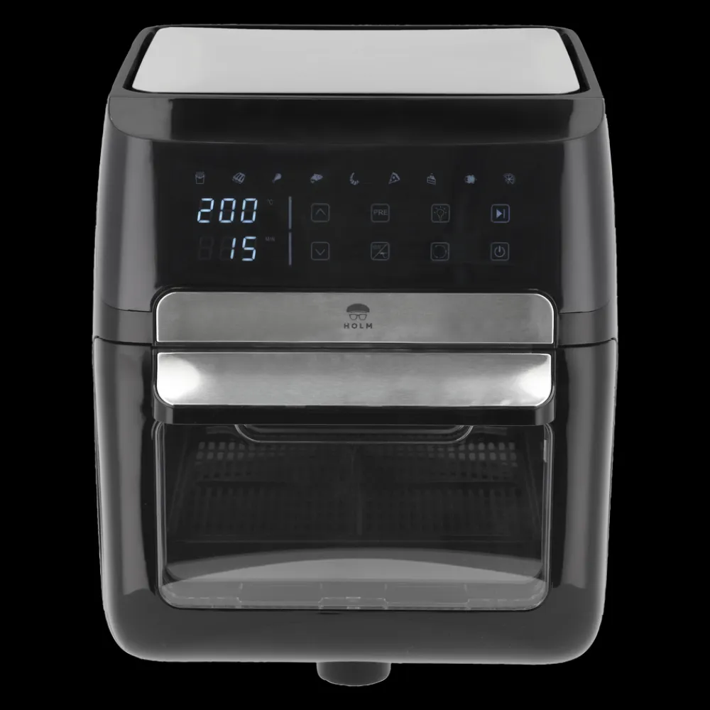 Airfryer-ovn 12 liter. I en airfryer tilberedes maden med cirkulerende varm luft i stedet for fritureolie, og fritterne får sprød og crispy overflade helt uden eller med meget små mængder olie.