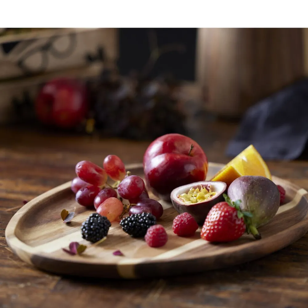 Lækkert serveringsfad i akacietræ i en flot organisk form. Fadet kan bruges til det meste, for eksempel tapas, kager, snacks, og det kan også stå uden indhold med akacietræets fantastiske farvespil som et dekorativt element. 30 x 24,5 x 1,5 cm.
