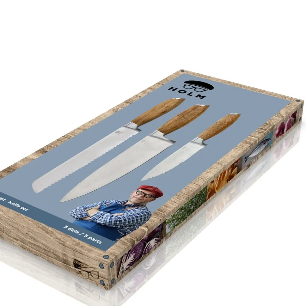 Knivsættet indeholder tre lækre knive – universalkniv 24 cm, kokkekniv 33 cm og brødkniv 33 cm. De flot rundede skafter, der ligger behageligt i hånden, er af akacietræ med virkeligt smukke og karakteristiske åretegninger og er afsluttet med en elegant stålkappe for enden af skaftet. Bladene er af rustfrit stål i høj kvalitet. Knivene skal vaskes i hånden med varmt vand og sæbe, også før første brug.