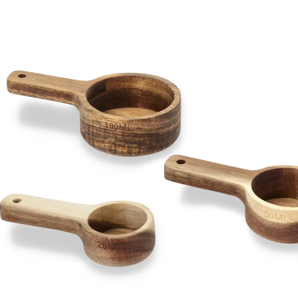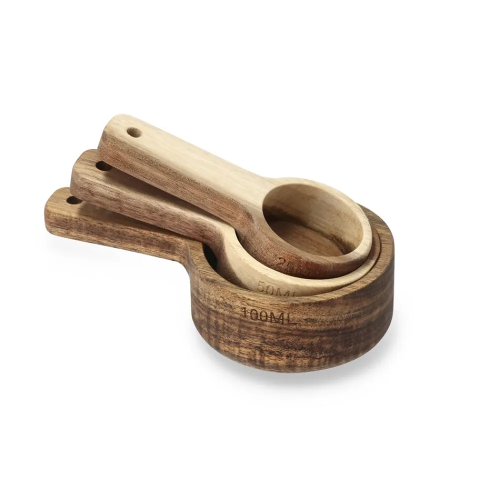 Sæt med tre måleskeer i smukt akacietræ med læderstrop. Skeerne måler 25, 50 og 100 ml, og måleangivelsen er præget på siden af skeerne. Læg aldrig akacietræ i blød. Vaskes med varmt vand og mild sæbe. Tåler ikke opvaskemaskine. Kan med fordel efterbehandles med madolie et par gange om året.