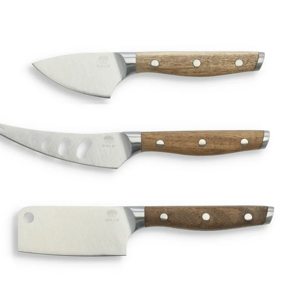 Ostesættet består af tre helsmedede knive i rustfrit stål med akacietræshåndtag med ståldetaljer. Sættet er både smukt at se på og rart at have i hånden. Her er du godt dækket ind til servering af hårde, bløde og cremede oste, og du kan også bruge sættet til charcuterie eller andet pålæg. Med den lille gaffel i spidsen af den ene kniv er det nemt at transportere ostestykket eller pålægget fra fad til tallerken. Vaskes i hånden med varmt vand og mild sæbe. Ikke egnet til opvaskemaskine. Akacietræet kan med fordel efterbehandles med madolie et par gange om året.