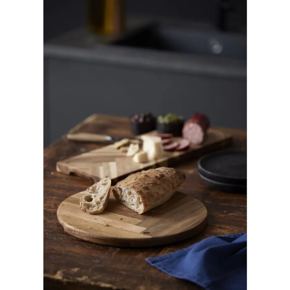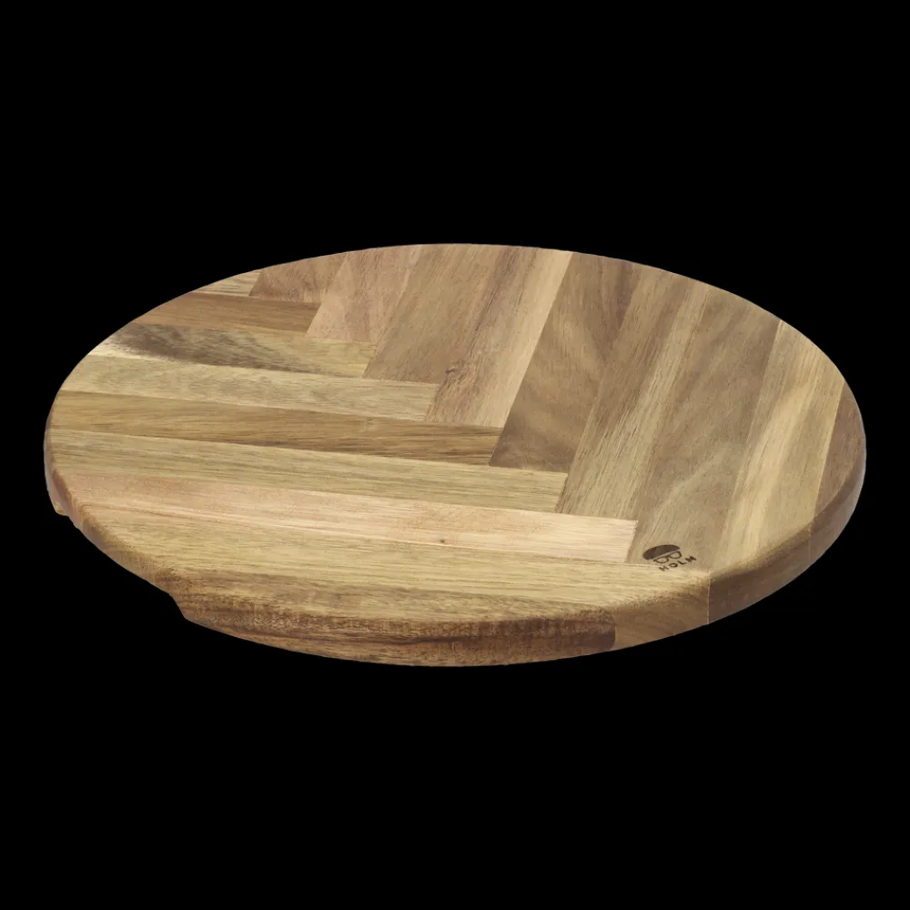 Rundt serveringsbræt af akacietræ i flot sildebensmønster. Brug det flotte serveringsbræt til servering af pizza, pålæg, bruschetta og andre antipasti-retter, ost eller andre retter, der skal præsenteres flot. Dia. 30,5 cm.