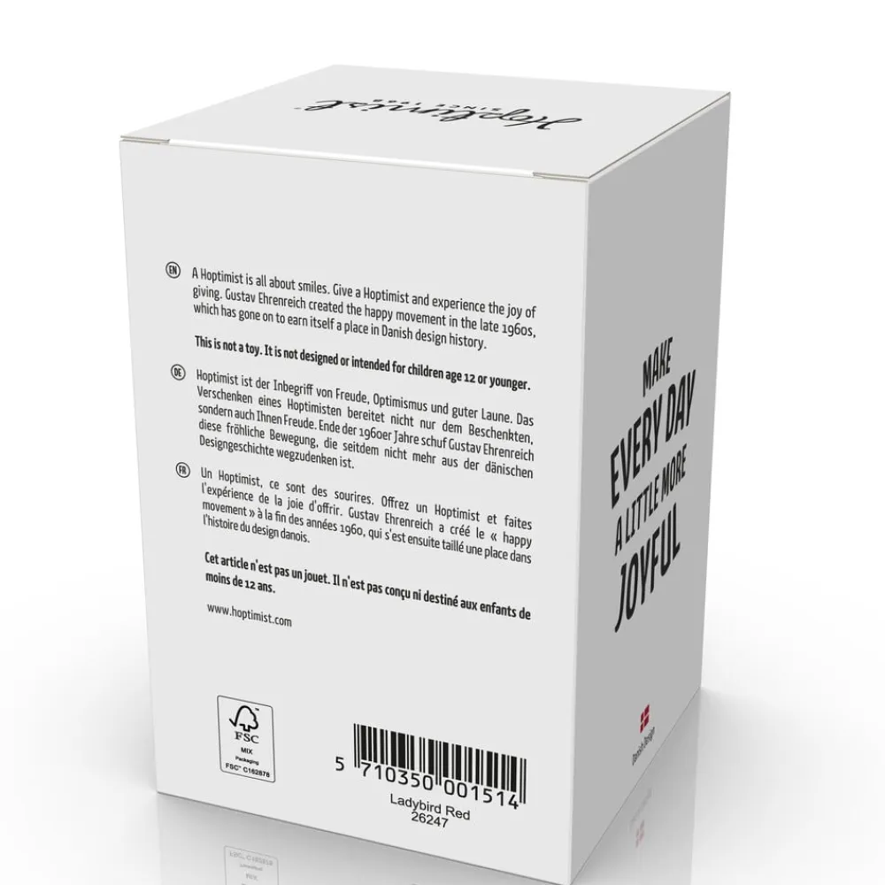 Om sommeren lyser den op i græsset. Det røde skjold med de sorte prikker vækker en barnlig begejstring i os alle. Mariehønen vil os noget godt, og det vil vores mariehøne-Hoptimist også. Den er en oplagt gaveidé til den, der har brug for lidt ekstra optimisme.