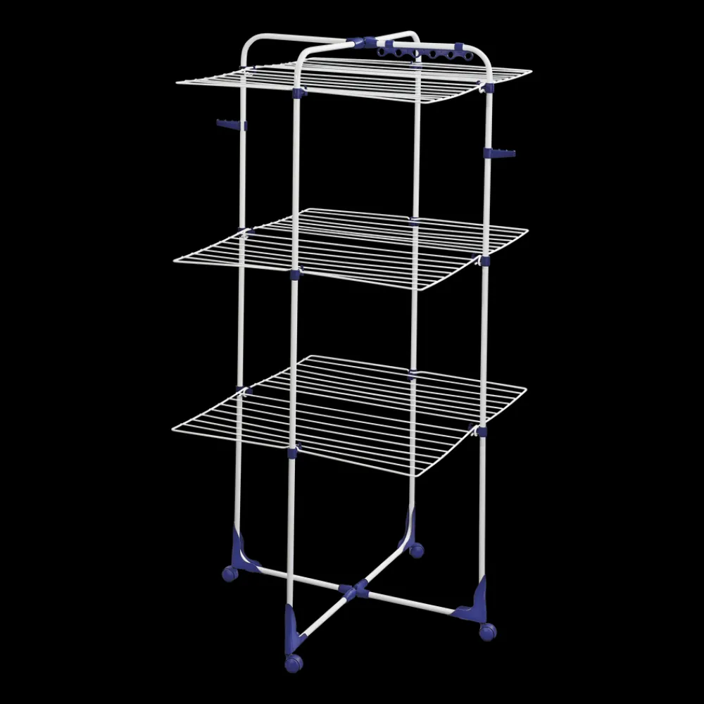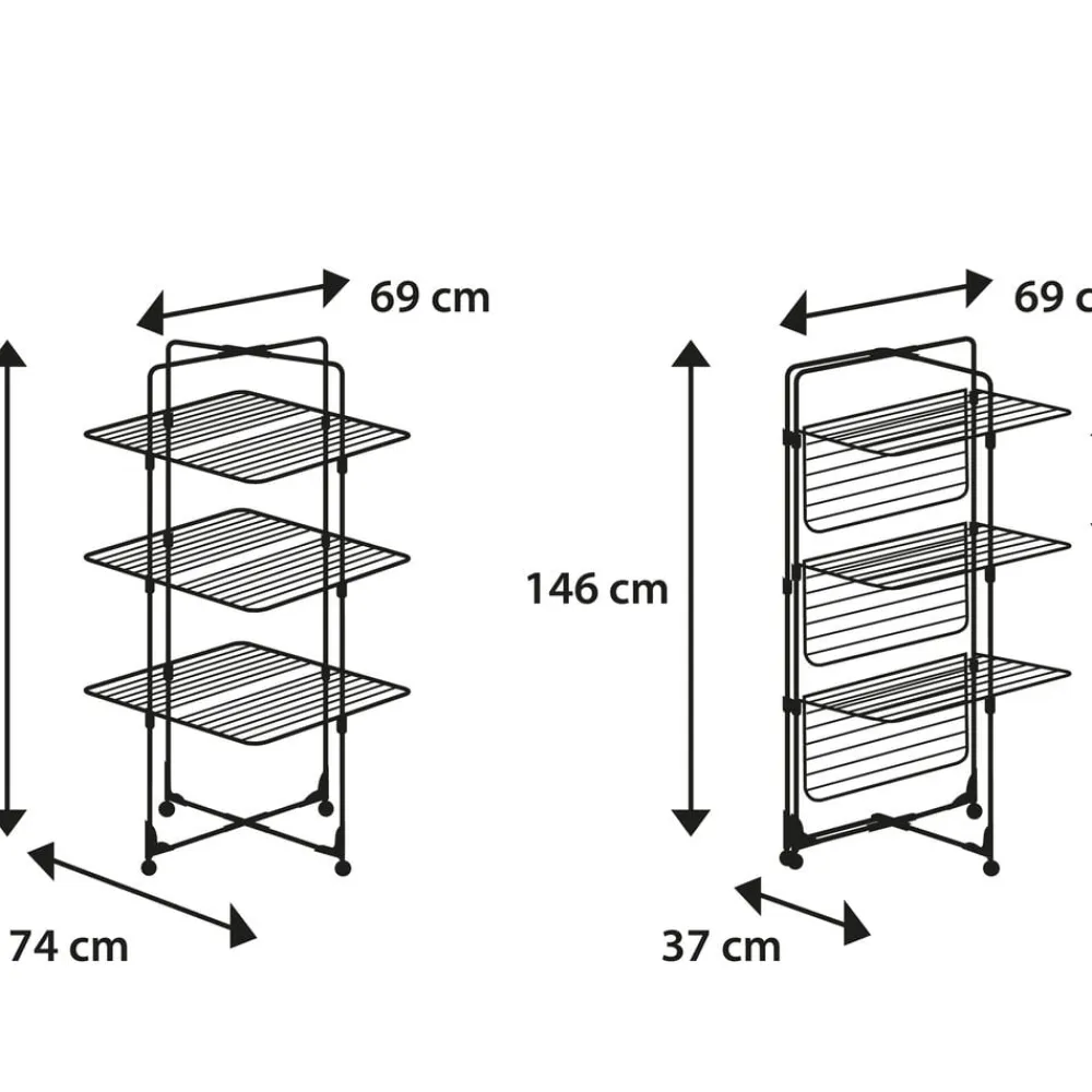 Classic Tower 340 fylder kun 69 x 73 cm og kan derfor nemt stå i brusebadet, på en lille balkon eller i en smal gang. Tre tørringsniveauer oven på hinanden giver 34 meter tørreplads, hvilket svarer til 3-4 maskinfulde tøj.