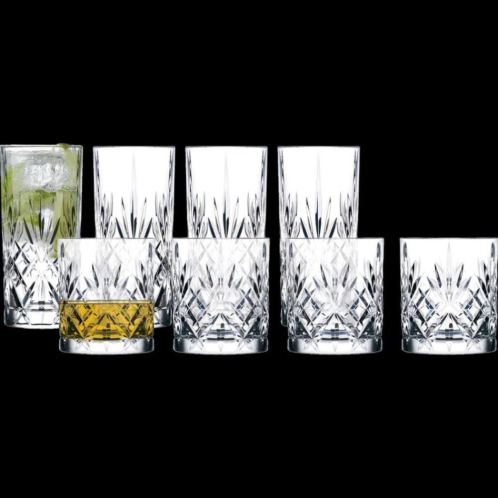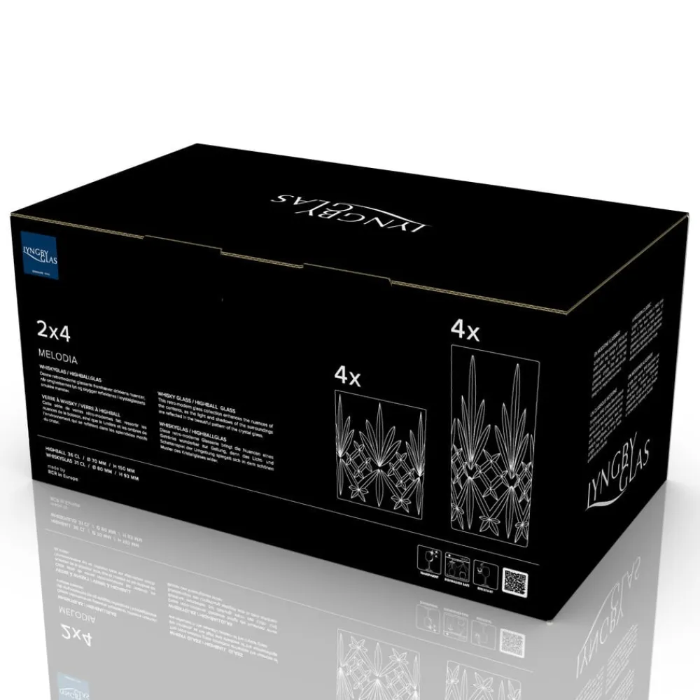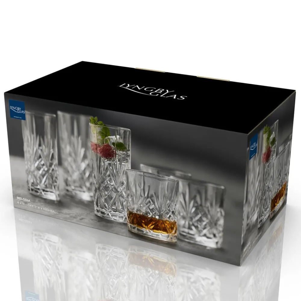 Sættet indeholder 4 stk. Melodia whisky glas, 31 cl, og 4 stk. Melodia highballglas, 36 cl. Denne retromoderne glasserie fremhæver drikkens nuancer, når omgivelsernes lys og skygger reflekteres i krystalglassets smukke mønster.