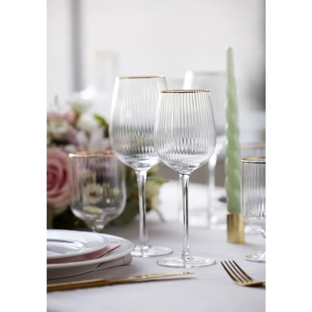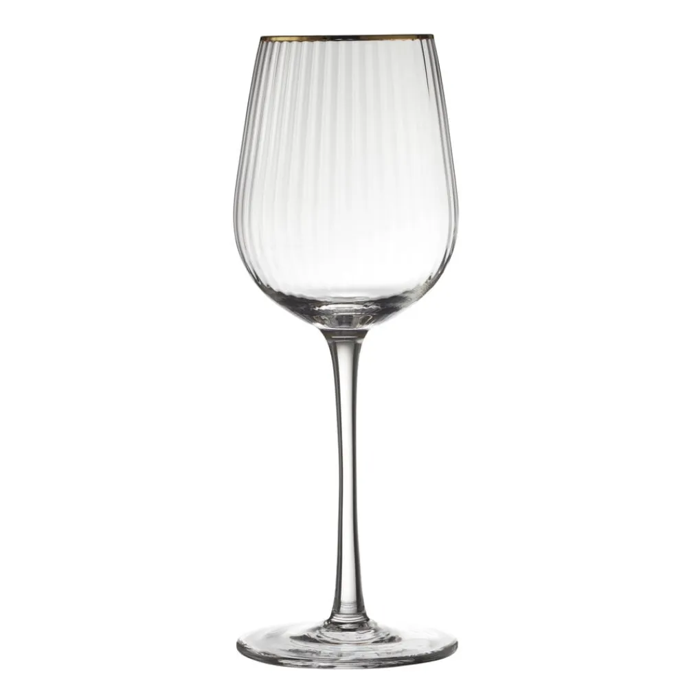 Smukt vinglas med bløde, rundede former. Det elegante, riflede design med en fin guldkant giver glasset et flot vintagelook, der samtidig afspejler tidens trends. Server din bedste vin i glasset og lad de fine facetter reflektere lyset og glassets indhold på smukkeste vis.