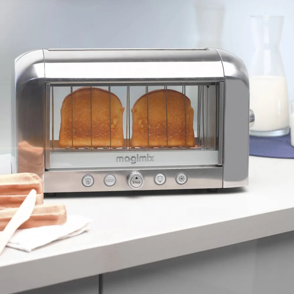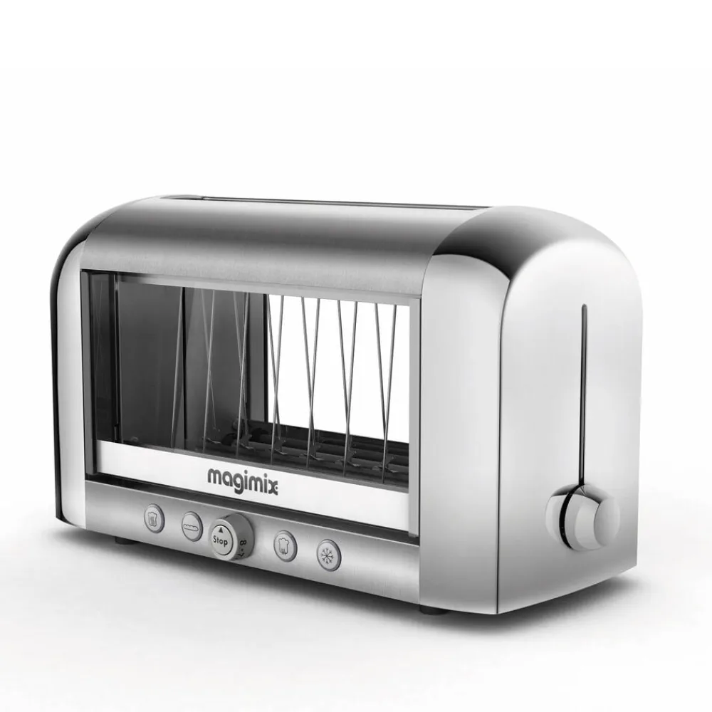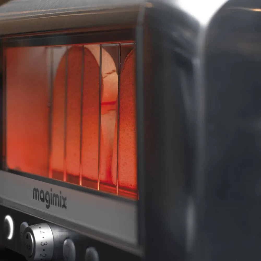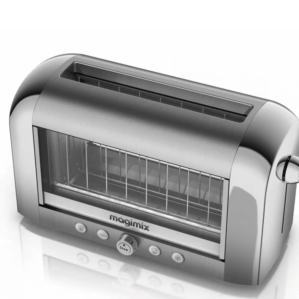 Verdens første gennemsigtige toaster, der gør det nemt at holde øje med brødets ristning. Professionel Magimix toaster, der rister, optør og varmer alle typer af brød bag isolerende dobbeltglas. Enkel at betjene med én knap pr. funktion og med plads til ekstra tykke skiver.